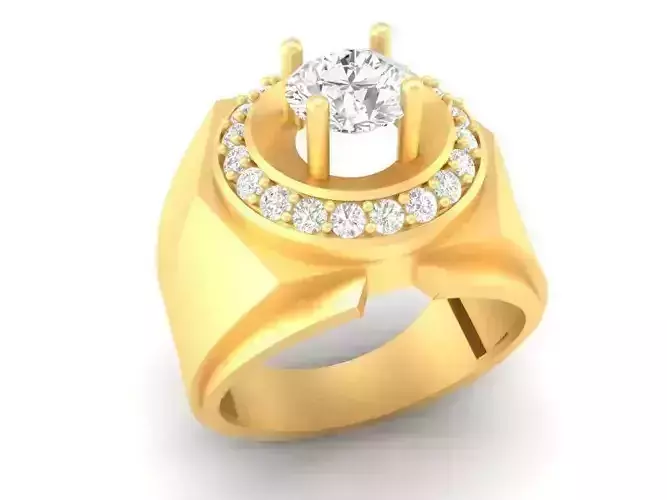 This 3D jewelry model features a luxurious men’s signet ring designed with a powerful and refined aesthetic. The centerpiece holds a large round diamond surrounded by a halo of smaller stones, symbolizing prestige and success. The ring’s geometric shoulders give it a bold architectural structure, balancing strength with modern elegance.