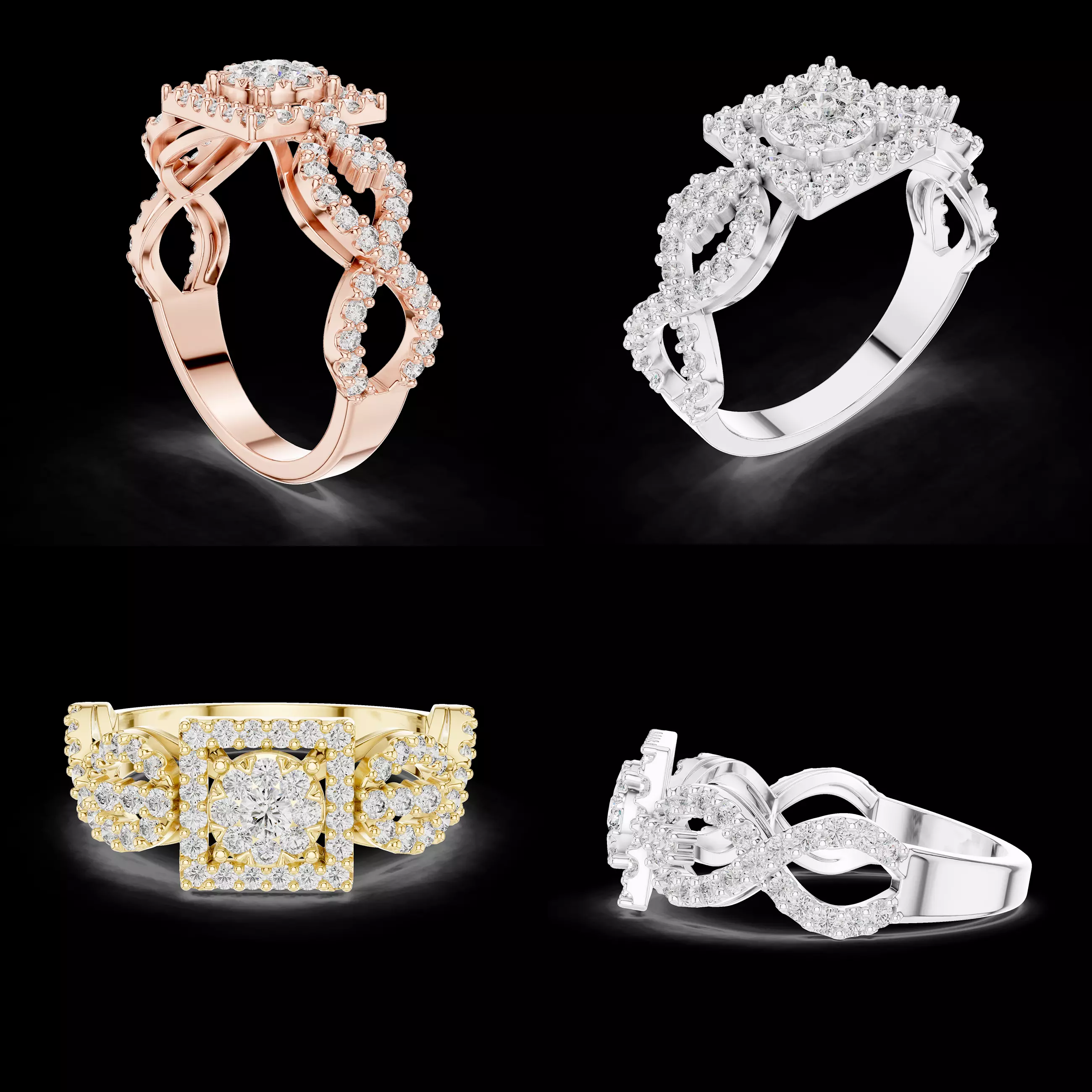 This luxury diamond square halo infinity ring CAD design features a bold square-shaped center cluster framed by a detailed halo, combined with an elegant infinity-style pavé shank. The design blends modern geometry with soft flowing curves, creating a unique and high-end visual appeal.