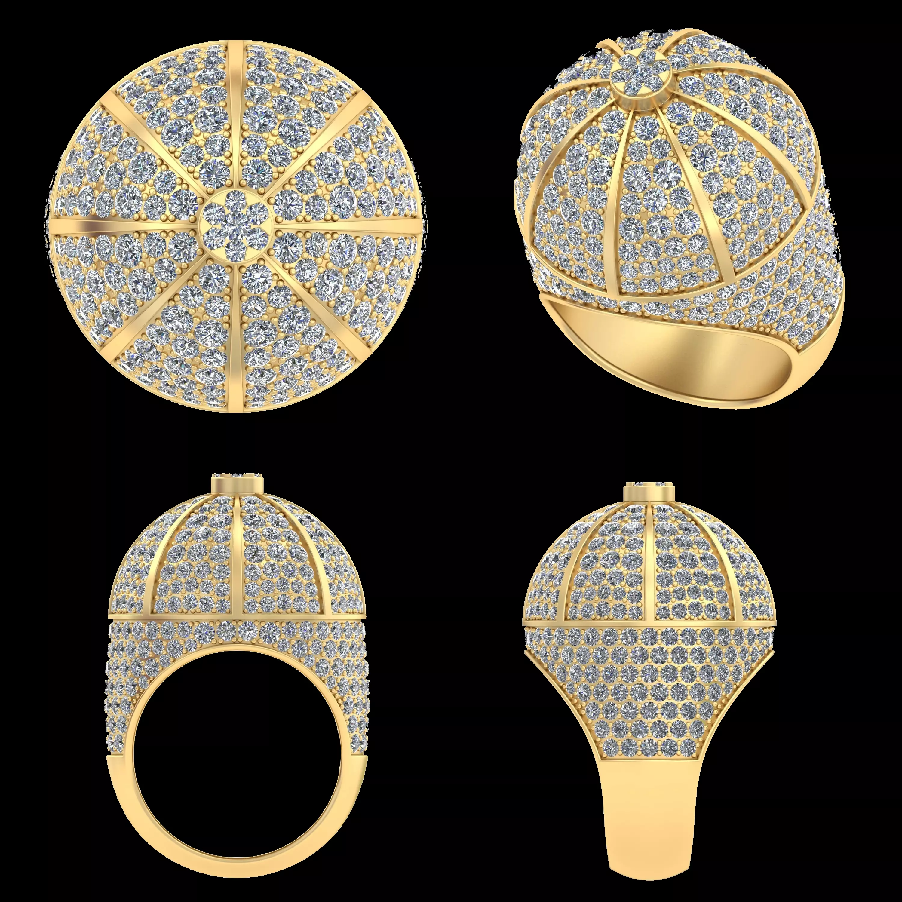 This Luxury Dome Pavé Diamond Statement Ring 3D model showcases a bold rounded dome structure enhanced with segmented gold ribs and full pavé stone coverage. The design creates a strong luxury presence while maintaining balanced geometry suitable for high-end jewellery collections.