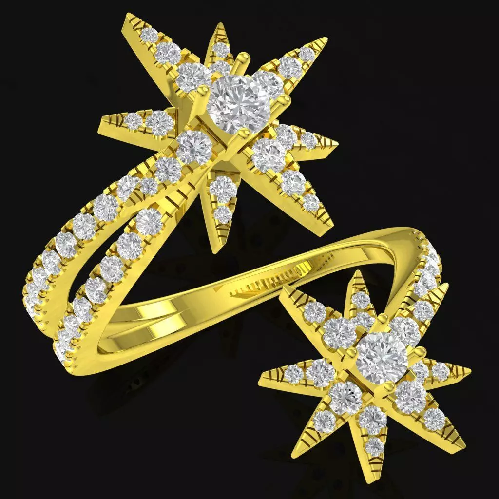The split shank design is pavé-set along both sides, enhancing brilliance and guiding the eye toward the star elements. Sharp, sculpted star rays add dimension and character, giving the ring a contemporary luxury appearance. Despite its expressive structure, the band is smoothly contoured to ensure comfort and stability when worn.