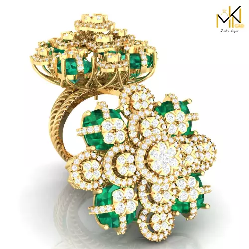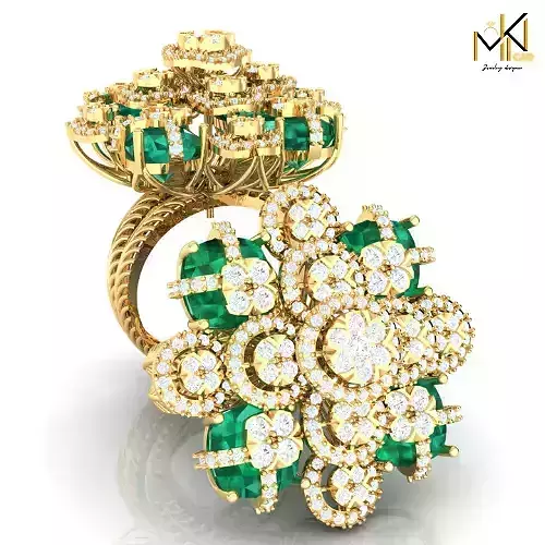 This exquisite 3D CAD model captures the essence of opulent floral design in a bold cocktail-style ring. The centerpiece is an intricate cluster of petals formed from rich emerald-cut stones and radiant round diamonds, arranged in a symmetrical floral motif. A double-height layered structure gives the ring volume and presence, making it ideal for high-fashion and special occasion collections.