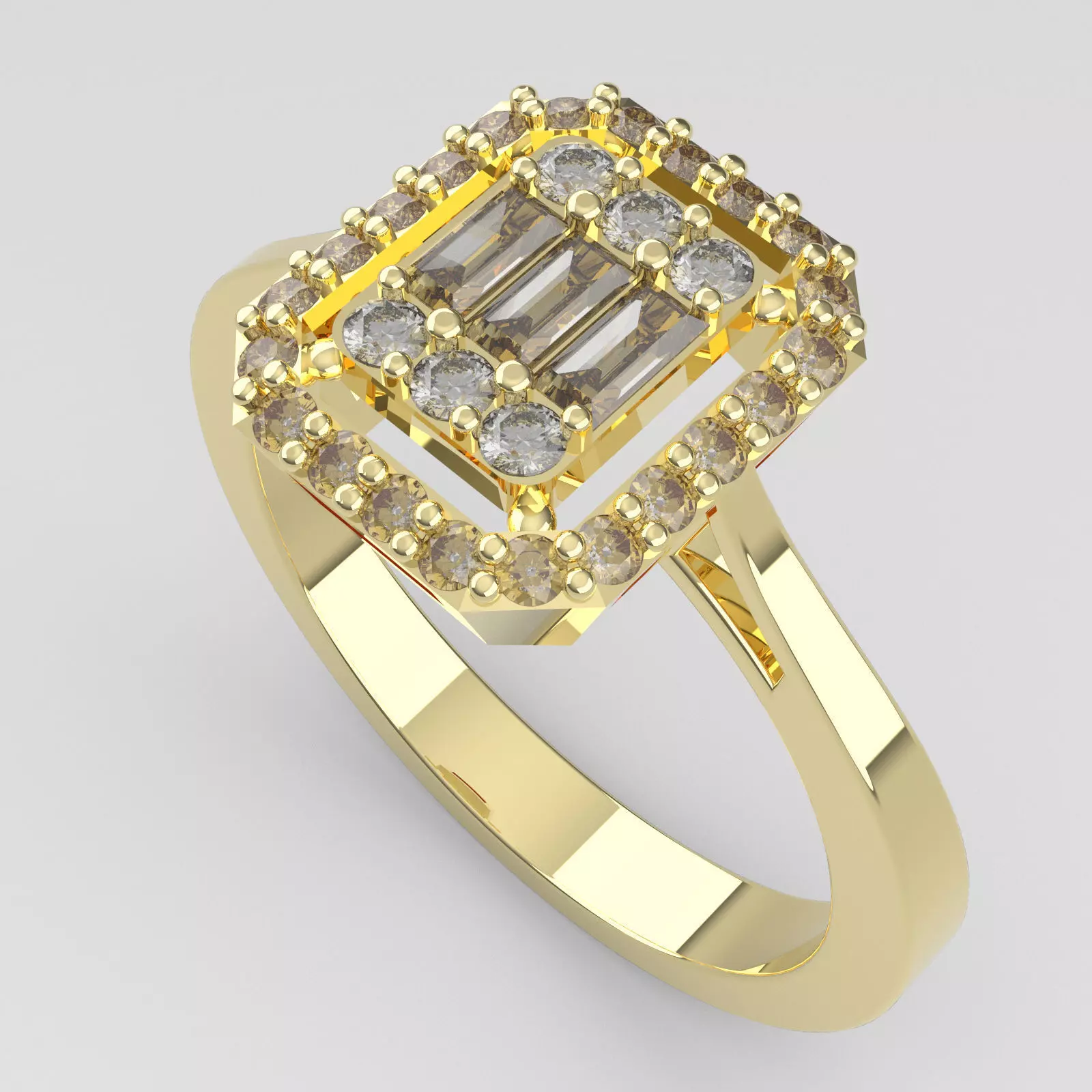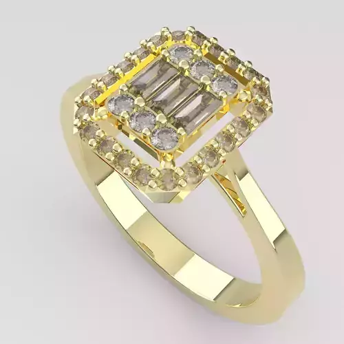 This exquisite gold ring showcases a sophisticated geometric design featuring a stunning combination of baguette and round-cut diamonds. The multi-layered diamond arrangement creates an elegant and timeless look, making it a perfect statement piece for special occasions. • Material: Yellow gold (or specify actual metal used) • Gemstones: Baguette-cut : 0.14 ct Round diamonds : 0.23 ct • Ring Size: 54 mm (inner circumference) • Design: Unique multi-layered setting with a luxurious sparkle • Ideal for: Engagements, special events, or fine jewelry collections