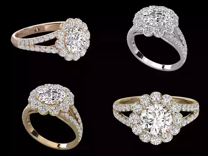 This luxury halo diamond engagement ring CAD design features a brilliant round center stone surrounded by a perfectly balanced halo of round diamonds. The design is enhanced with a refined split shank structure, adding depth, elegance, and a premium visual presence while maintaining excellent structural strength.
