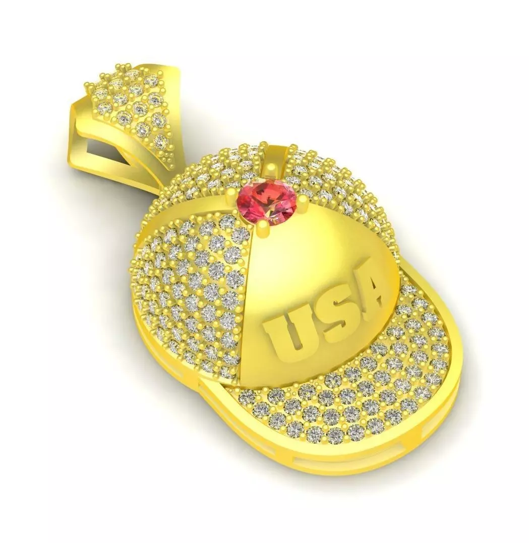 This luxury USA cap pavé diamond pendant features a bold and modern design inspired by street style and iconic American symbolism. The pendant is shaped like a classic baseball cap, with detailed pavé stone settings covering selected surfaces to create strong brilliance and visual contrast. A raised center stone on the top adds depth and highlights the premium character of the design.