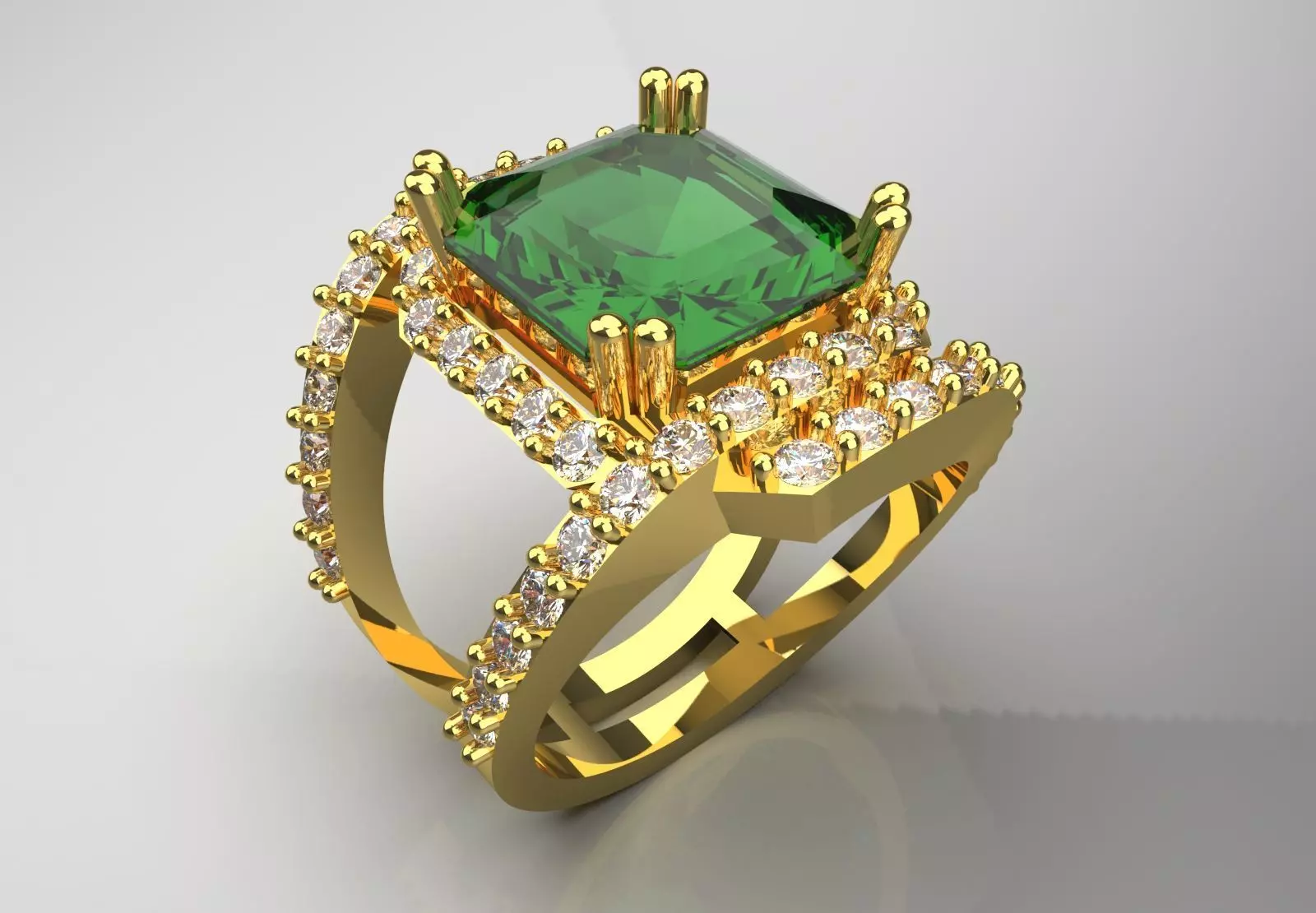 This women's ring with its luxurious and striking design features a square green emerald in the center, surrounded by two halos of round brilliant diamonds. The ring is also decorated with a row of diamonds, giving it a continuous and glamorous shine. This combination of gems and design is an ideal choice for women who are looking for a luxurious, classic and at the same time modern jewelry.