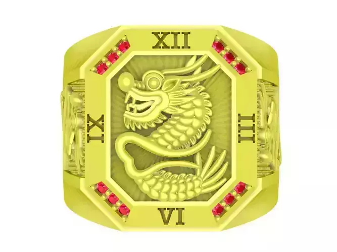 This luxury men’s ring design features a powerful dragon motif combined with Roman numeral detailing on an octagonal top surface. The sculpted dragon symbolizes strength, authority, and protection, while the Roman numerals add a timeless and regal character to the design.
