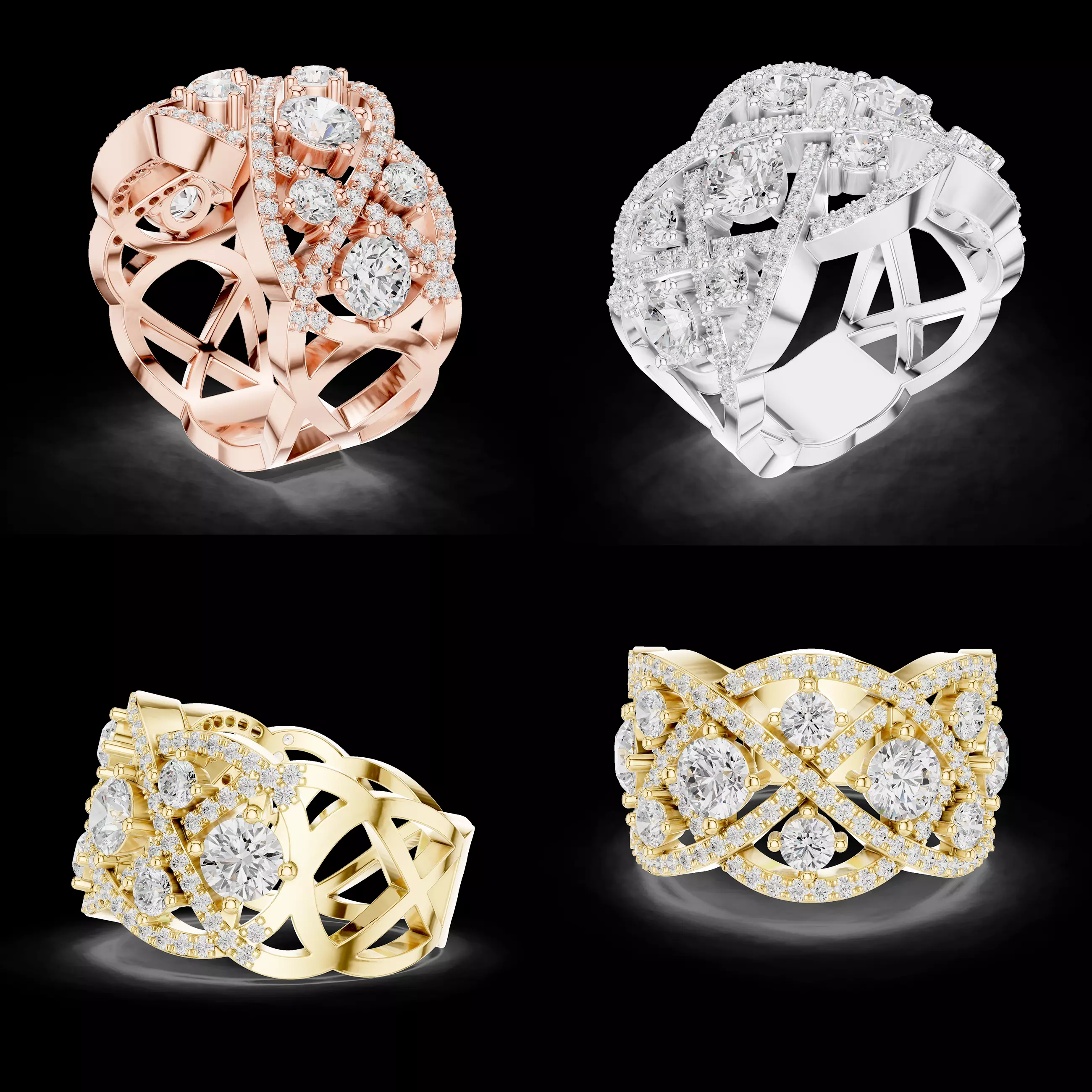 This luxury lattice diamond ring CAD design features an intricate criss-cross and interlaced structure crafted for high-end statement jewelry. The top surface is composed of multiple round diamonds arranged within a bold architectural framework, creating depth, brilliance, and a strong visual presence.