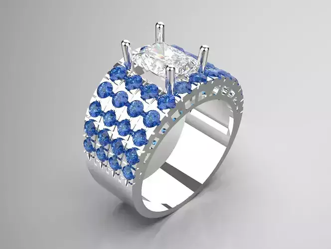 The image shows a luxurious ring that features an intricate design. The ring has a wide band made of a shiny metallic material, possibly platinum or white gold. At the top center, there is a large, prominent square-shaped diamond held in place by four prongs. Surrounding the main diamond on the sides are multiple smaller round-cut blue gemstones, arranged in a grid pattern that covers a significant portion of the ring's surface. The overall design is bold and elaborate, blending classic elegance with a modern, statement-making style. The background is a neutral, light grey, allowing the ring's details to stand out clearly.