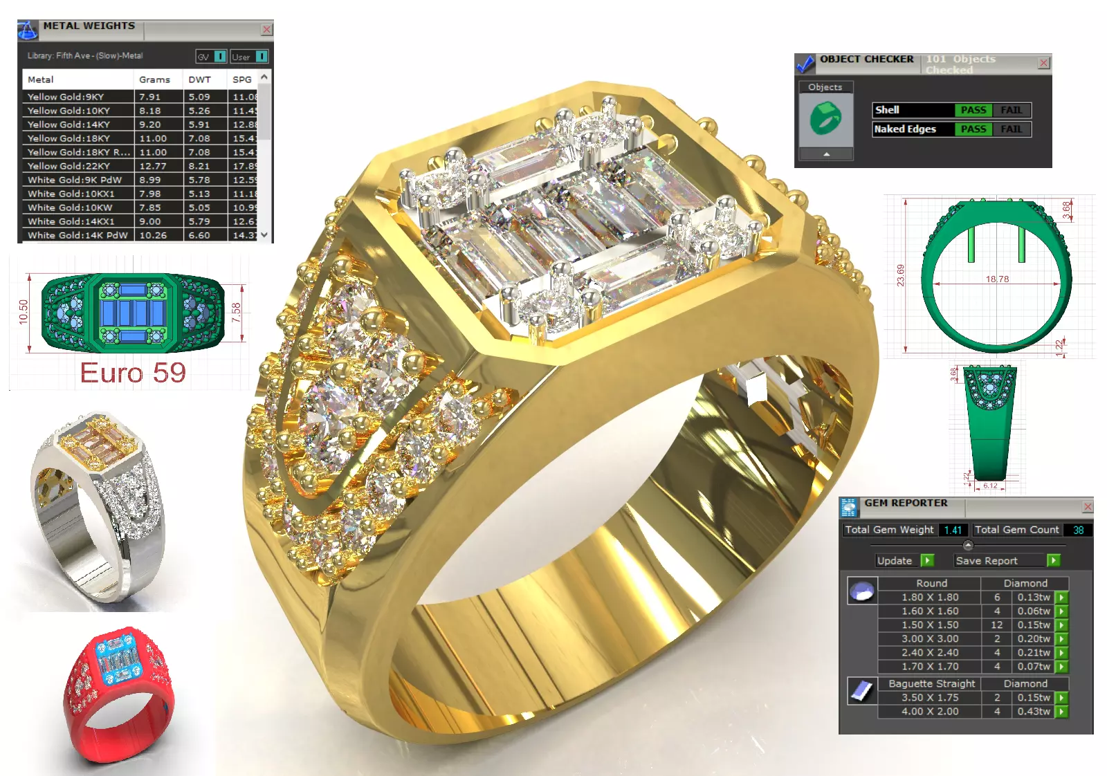 Diamond Size and Carat Weight: 32 round brilliant cut diamonds and 6 baguette cut diamonds. Total diamond weight 1.41 carat. Check the diamond chart attached in the image.