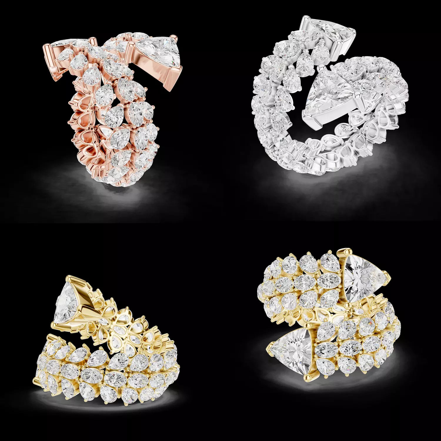 This luxury multi-stone diamond ring CAD model features a bold and glamorous design composed of multiple marquise and pear-shaped stones arranged in layered rows that create exceptional brilliance and visual depth. The ring presents a statement look designed for high-end jewellery collections and special occasion pieces.