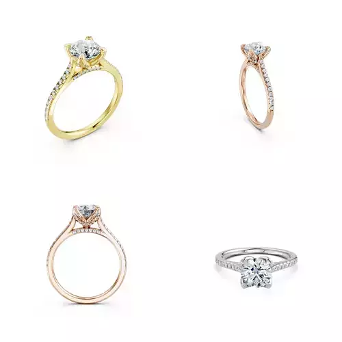 This luxury pavé solitaire engagement ring CAD model showcases a timeless round brilliant center stone secured in an elegant prong setting. The slim band is beautifully enhanced with precision pavé diamonds along the shoulders, creating a refined sparkle while maintaining a clean and balanced profile.