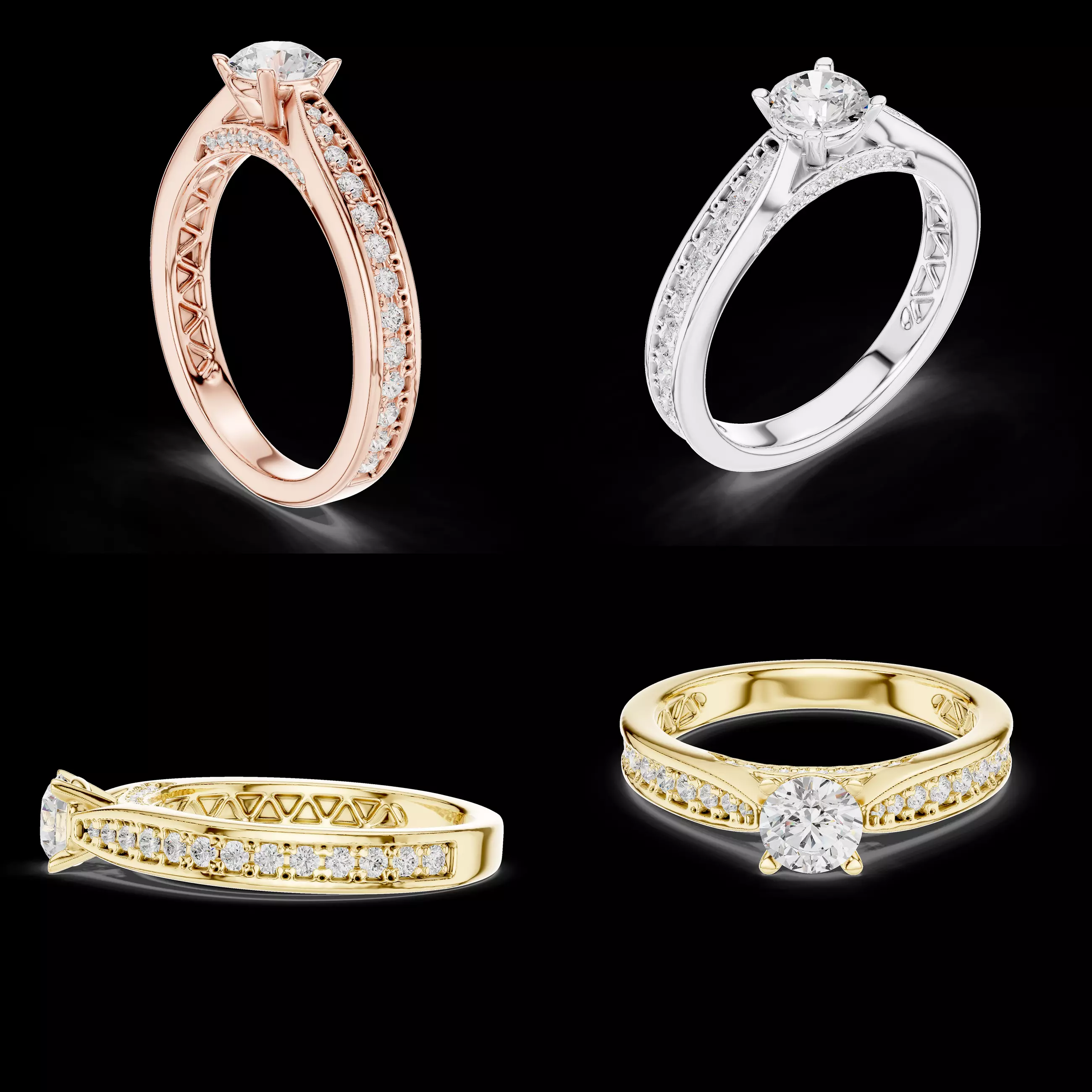 This professional jewellery CAD model presents a refined solitaire engagement ring enhanced with pavé-set shoulders and a decorative inner gallery structure. The design balances premium visual appeal with strong technical construction, making it suitable for both luxury collections and real-world manufacturing workflows.