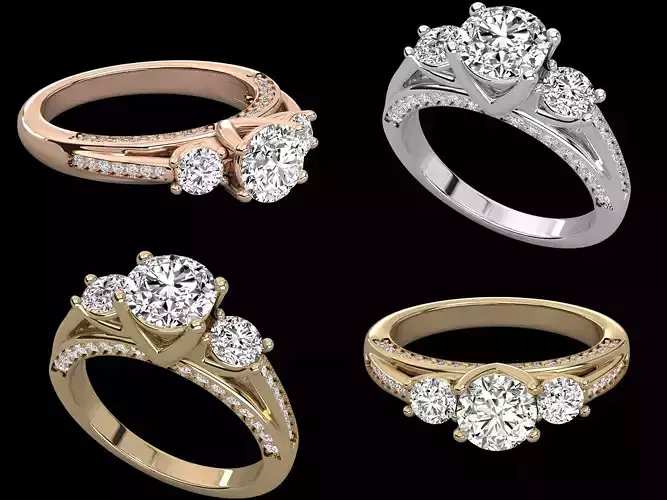 This luxury pavé three stone diamond ring CAD design is created to deliver an elegant visual appeal combined with strong and reliable jewellery engineering. The design features a beautifully proportioned round center stone flanked by two side stones, enhanced further by pavé detailing along the band to add continuous brilliance and depth.