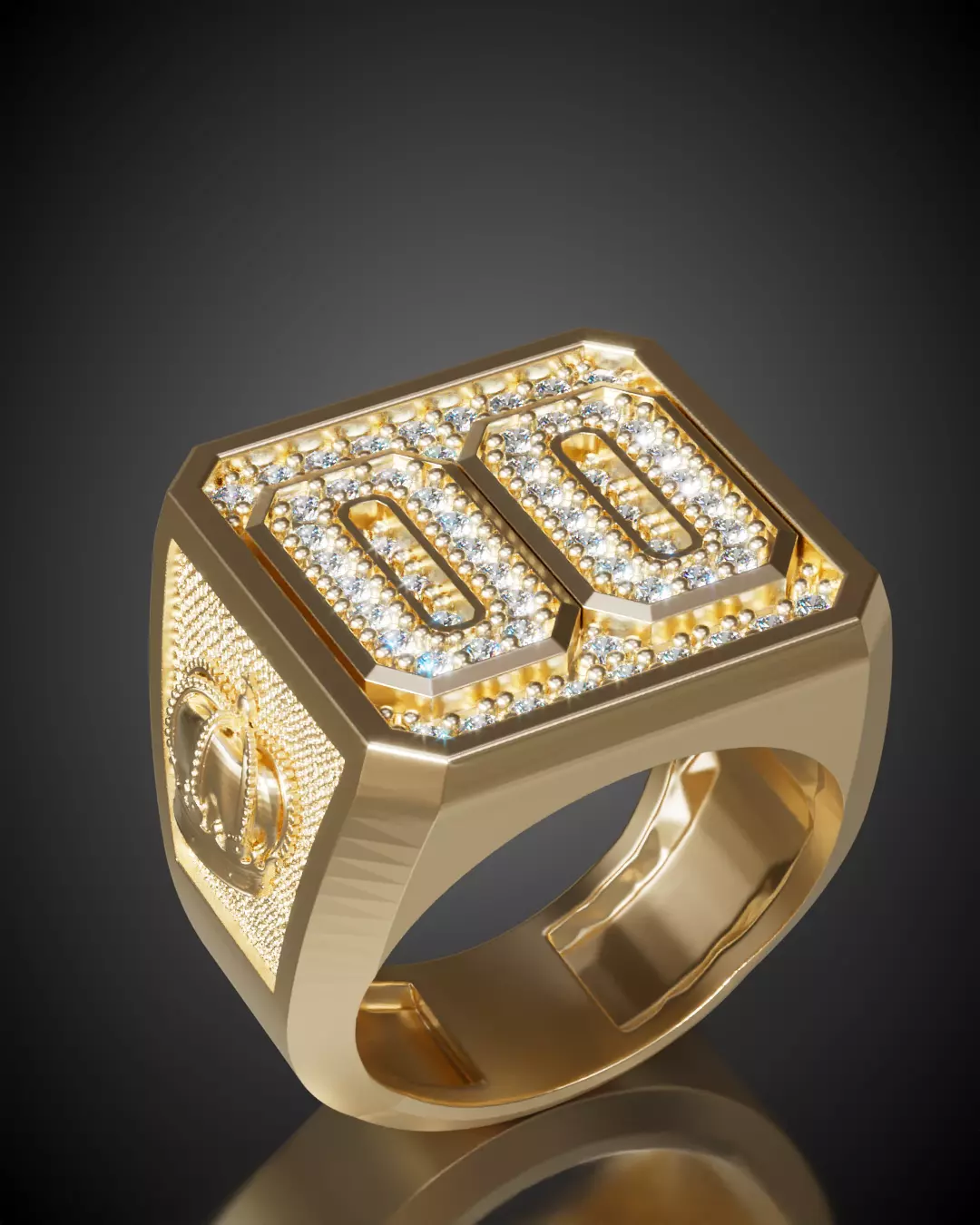 Impressive, high-end ring with a square head design and the number 00 fully set in stone on the top.