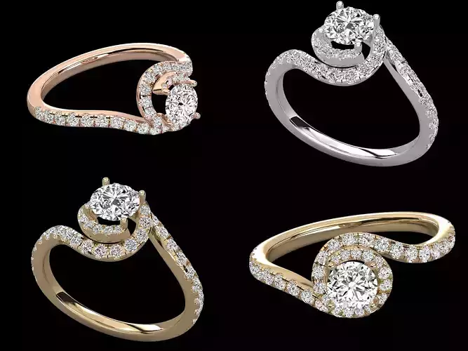 This elegant swirl-style solitaire diamond ring CAD design features a modern flowing band that wraps gracefully around the center stone. The round solitaire is highlighted with a pavé-set halo accent, while the wave-inspired shank adds movement, brilliance, and a contemporary luxury appeal.