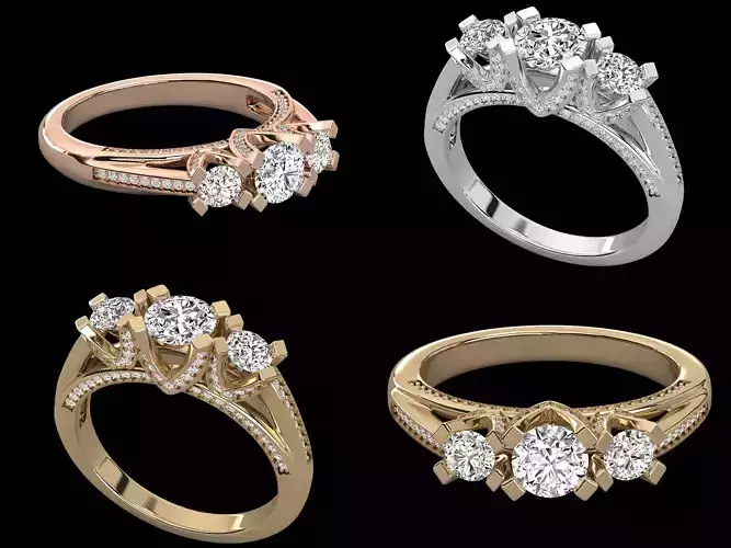 This luxury three stone diamond ring CAD design features a beautifully crafted round center stone highlighted by two perfectly matched side stones. The design is enhanced with elegant pavé detailing along the shank and under-gallery, adding depth, brilliance, and a high-end luxury feel. The sculpted prong structure provides a strong yet refined look, making the ring visually rich from every angle.