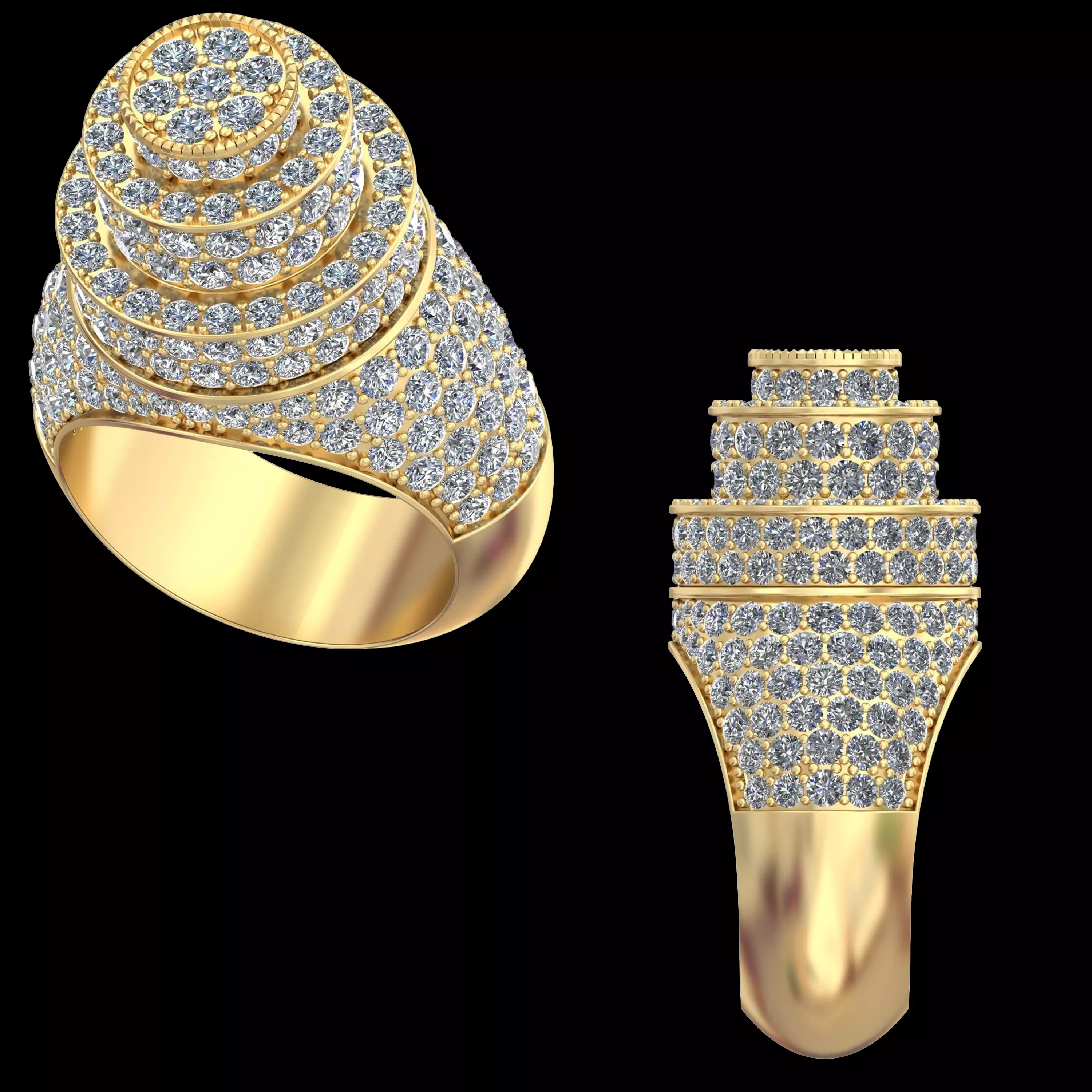 This premium tiered dome diamond ring 3D model is designed for luxury jewellery manufacturing and high-end statement collections. The design features a bold multi-level circular dome top composed of concentric diamond rows arranged in a stepped structure, producing exceptional brilliance and strong architectural depth.
