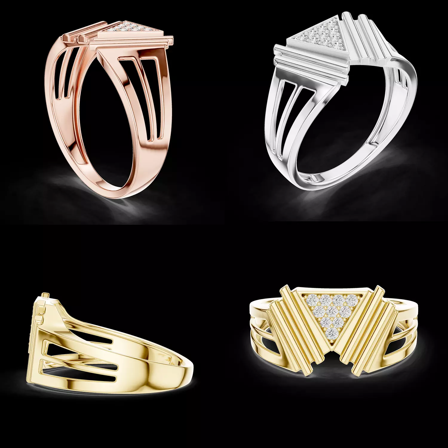 Important Points:Ready for casting and productionUnique triangular diamond cluster designBold geometric and layered structureOpen band for lightweight comfortClean and precise CAD modelEasy resizing and customizationSuitable for all precious metalsHigh-quality professional jewellery design