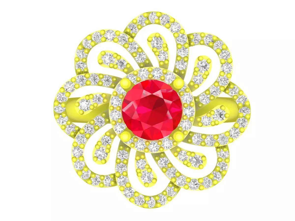 This luxury floral cluster ring jewelry design is inspired by an elegant flower motif, featuring a round center gemstone surrounded by delicate petal-shaped diamond settings. The open floral structure enhances brilliance while creating a refined and feminine appearance.