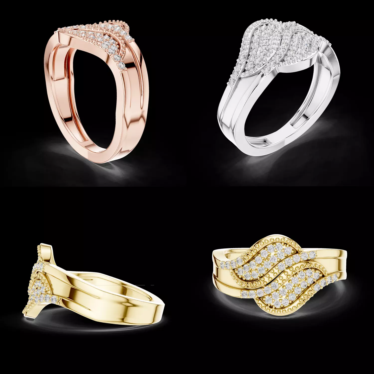 This luxury wave-inspired diamond ring 3D model features a bold and modern design with flowing curves and layered diamond settings. The top of the ring showcases elegant wave-like structures that overlap gracefully, creating a dynamic and sophisticated appearance. Each curved section is decorated with pavé-set diamonds that enhance the brilliance and luxurious feel of the design.