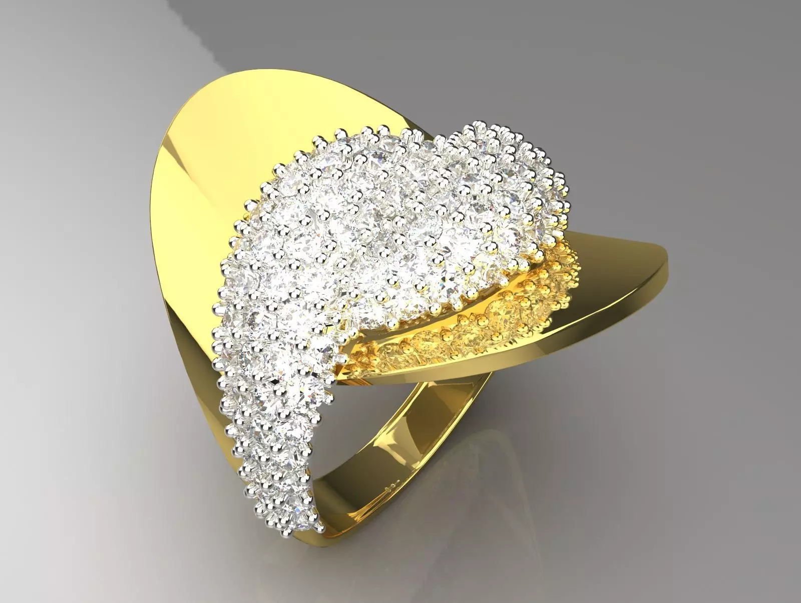 This ring with a unique and modern design is a combination of brilliance and elegance. Its surface is designed with thousands of small and prominent diamond gems that captivate every look. A luxurious gold-colored structure conveys a sense of prestige and charm to you. This piece is a symbol of luxury and beauty and is an ideal choice for special celebrations, parties or a unique gift. Its unique design complements any style and makes you stand out. High quality and elegance in details ensure lasting value. This ring is a special and memorable piece for every stylish and modern woman.