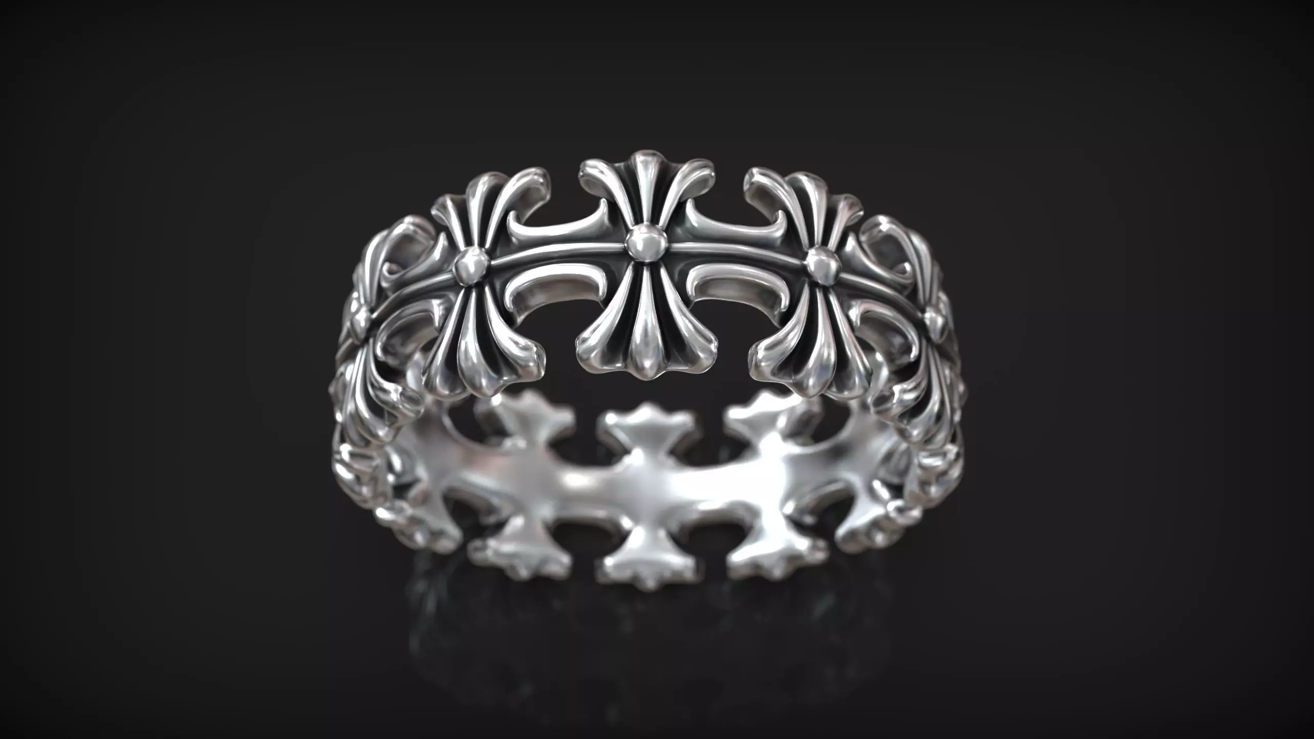This detailed 3D model showcases a beautifully crafted Gothic-style band ring featuring repeating cross flower motifs. Designed with intricate high-relief elements and an openwork structure, this ring combines classic Gothic aesthetics with a modern edge. Perfect for adding a unique, bold accent to any jewelry collection. The model is optimized for high-quality 3D printing, casting in precious metals, and rendering for commercial projects or custom commissions.