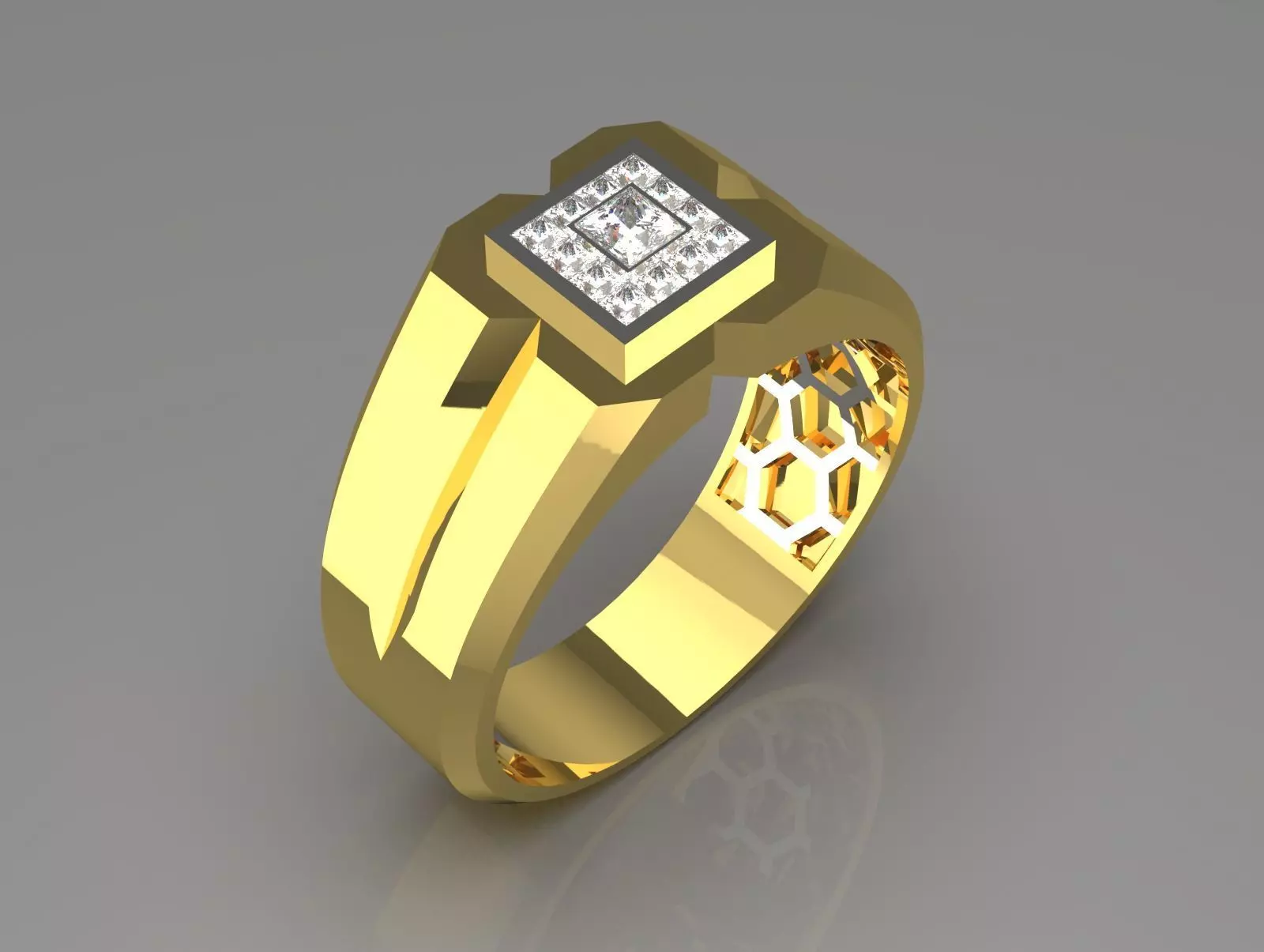 The ring features a bold, modern design crafted from yellow gold. It has a wide band with geometric lines, giving it a strong visual presence. The top is adorned with a square setting that holds multiple small diamonds, arranged in a way to create a sparkling effect. The inner side of the band showcases a unique honeycomb pattern, adding an elegant touch to the overall design. This ring combines contemporary aesthetics with a touch of luxury, making it a striking piece of jewelry.