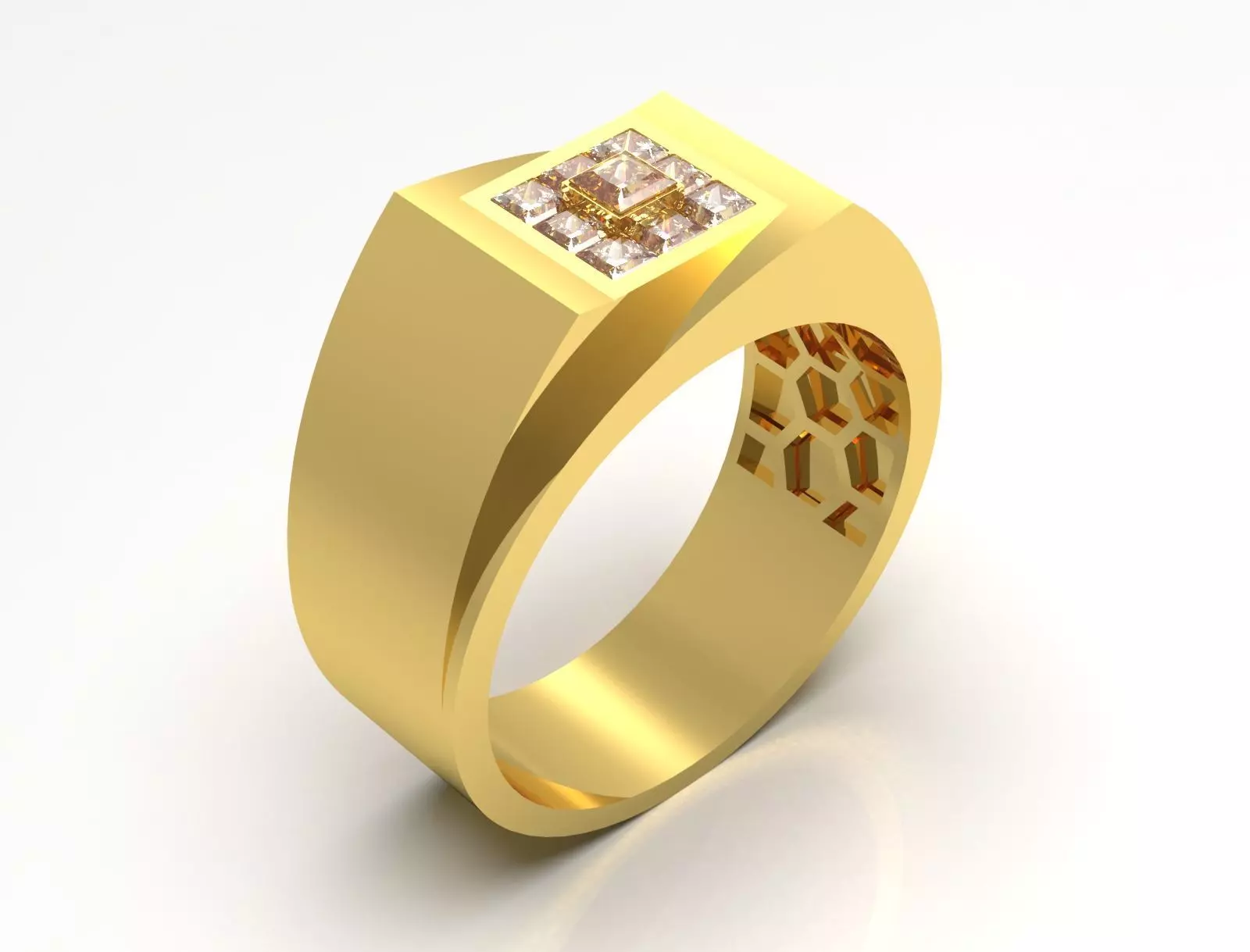 The ring features a sleek, modern design crafted in a rich gold tone. At the center, it showcases a square arrangement of sparkling stones, adding a touch of elegance and sophistication. The band is smooth and thick, providing a sturdy feel, while the intricate geometric pattern on the inside adds an unexpected detail. Overall, this ring combines boldness with a luxurious aesthetic, making it a striking accessory.