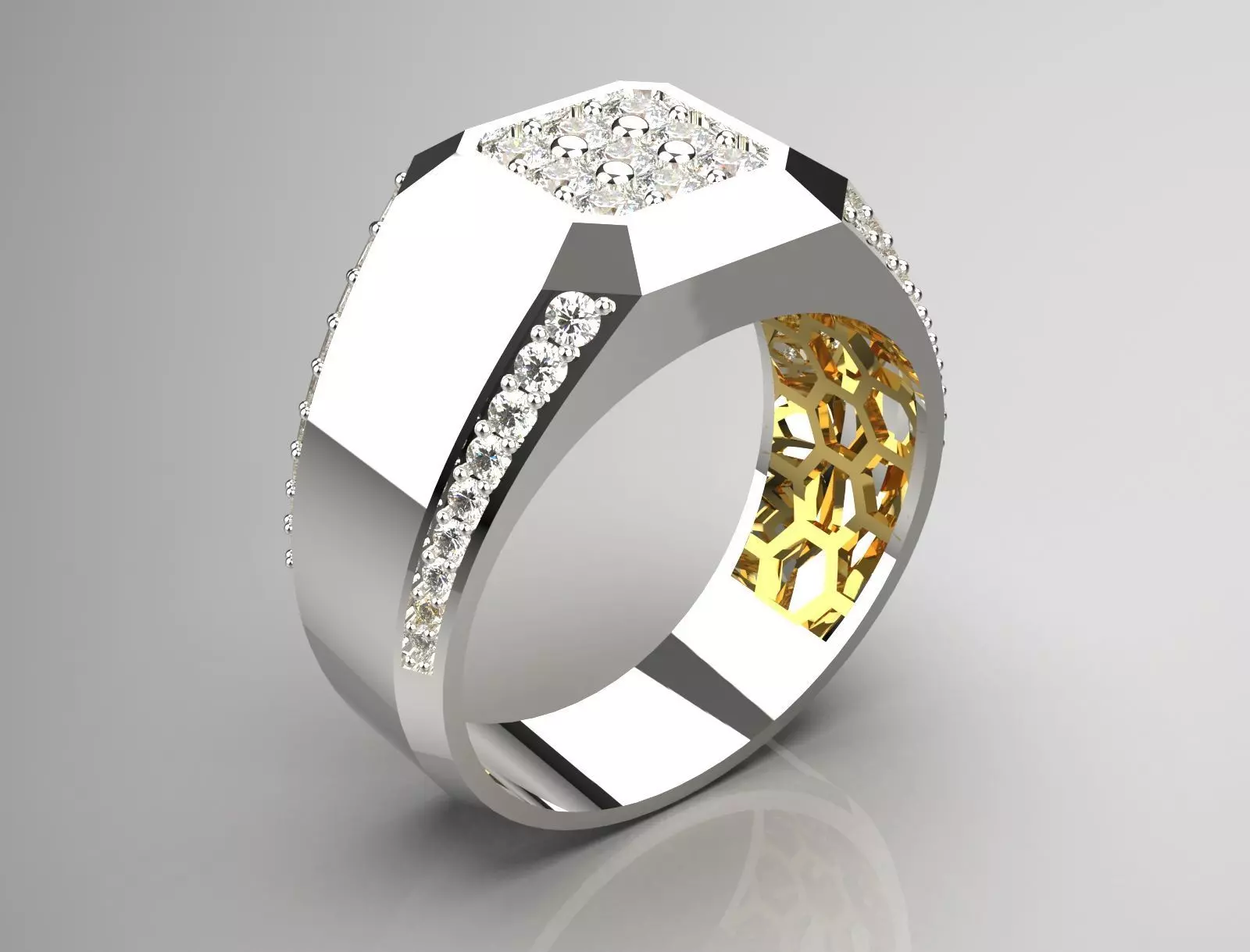 Material: The ring has a polished silver surface that glistens under light.Design: It features a hexagonal top, embellished with multiple small stones, likely diamonds or cubic zirconia, creating a sparkling effect.Side Details: Along the sides, there are additional stones that enhance its luxurious appearance.Interior Design: The inner part of the ring displays a decorative pattern in gold, which adds an elegant contrast to the silver exterior.Overall, this ring combines contemporary design with a classic touch, making it a striking piece of jewelry.