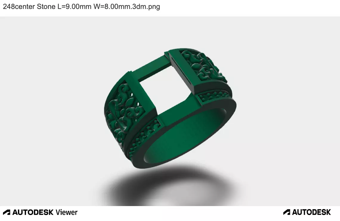 The 3D model depicts a ring with a rectangular main stone measuring 9mm x 8mm. It features a sleek band and intricate flower designs adorning the sides, adding a touch of elegance and charm. A captivating piece combining beauty and sophistication.