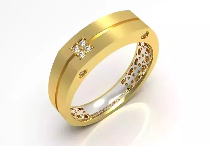 The technical design of this ring reveals different layers of beauty. The top part has a shiny central groove surrounded by a matte gold surface and leads to a diamond-cut square. Set in a bed of white gold, this square houses four round brilliant diamonds that give the ring an incomparable shine. But the highlight of the design is the precise and artistic lattice design that is located on the inner surface of the ring. This hidden detail not only adds to the beauty of the ring, but also helps in air circulation and greater comfort during use.
