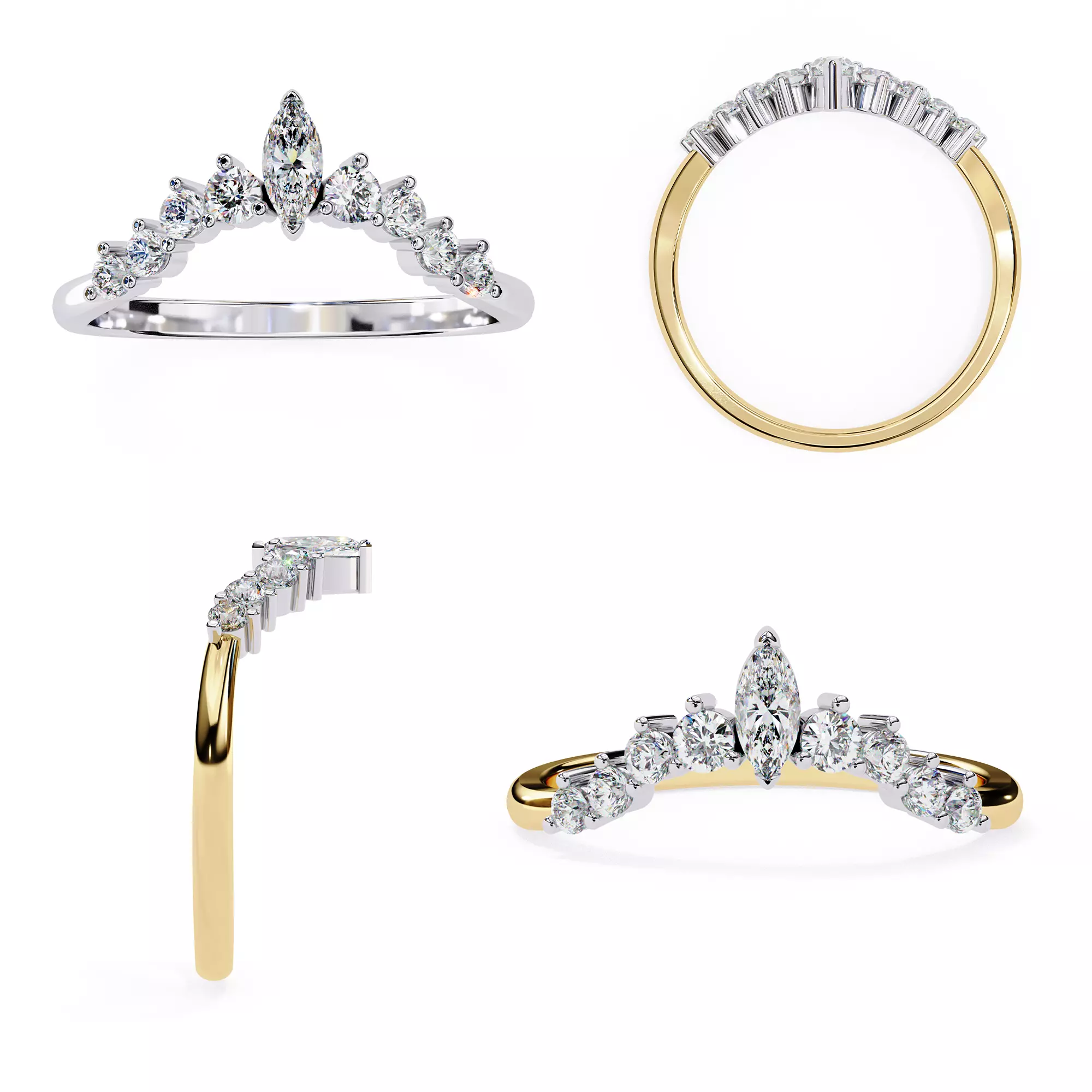 This elegant curved diamond crown band features a high-set marquise-cut center stone surrounded by graduated round brilliant diamonds.Designed for perfect stacking with engagement rings, this piece is ideal for jewelers, CAD modelers, and manufacturers seeking a clean, production-ready jewelry model.