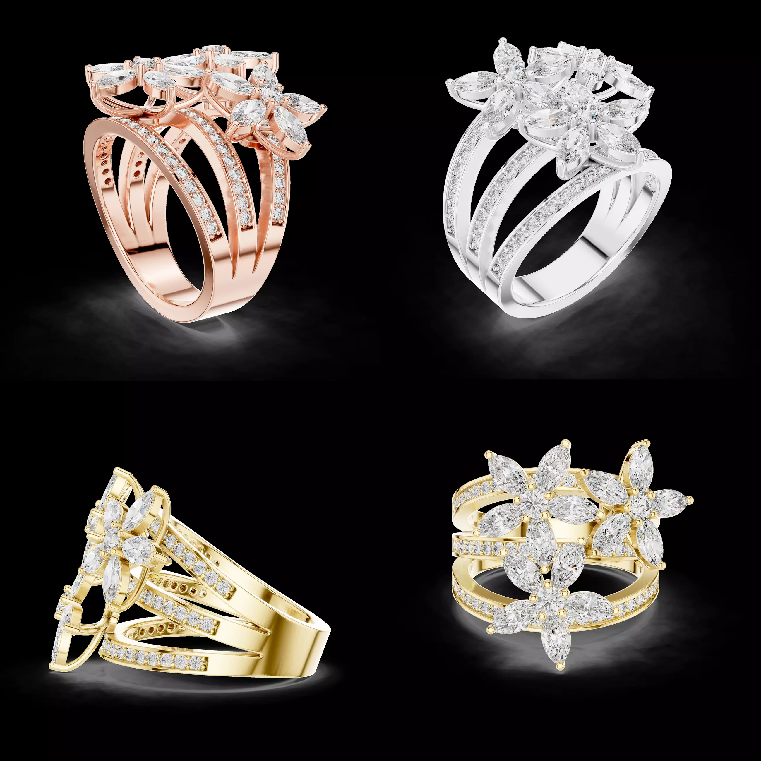 Manufacturing-ready CAD structureSecure prong setting for marquise diamondsBalanced multi-band construction for durabilityOptimized metal weight for production efficiencyClean topology for smooth polishing and finishingEasy resizing and design customizationCompatible with standard jewelry manufacturing workflows