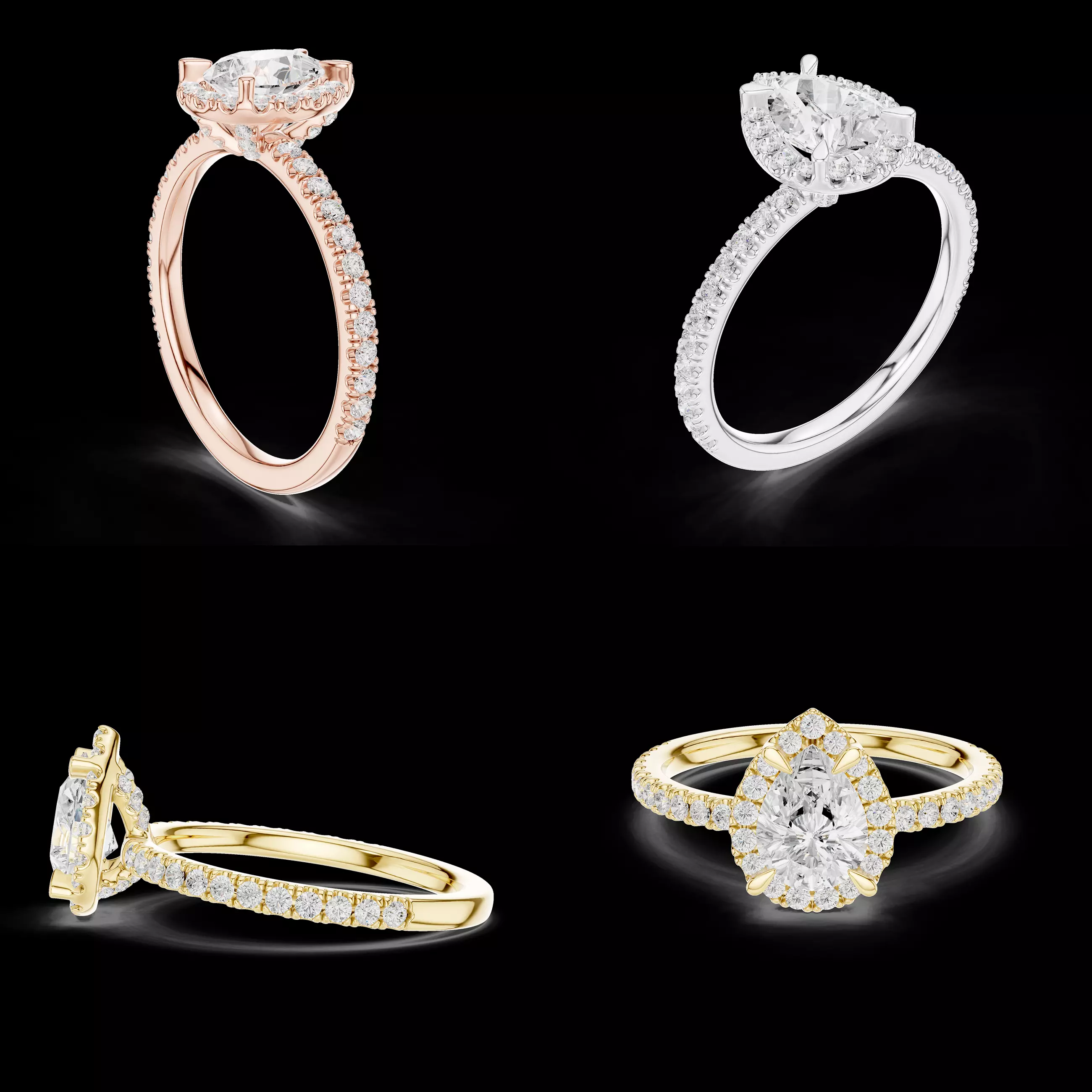 The ring is professionally modeled for real jewellery CAD and manufacturing workflows. The prong system is designed to securely support the pear-cut center stone, while the halo and pavé stones are positioned with accurate spacing for practical stone setting. The gallery beneath the head is clean and open, allowing good light performance and functional access during production.