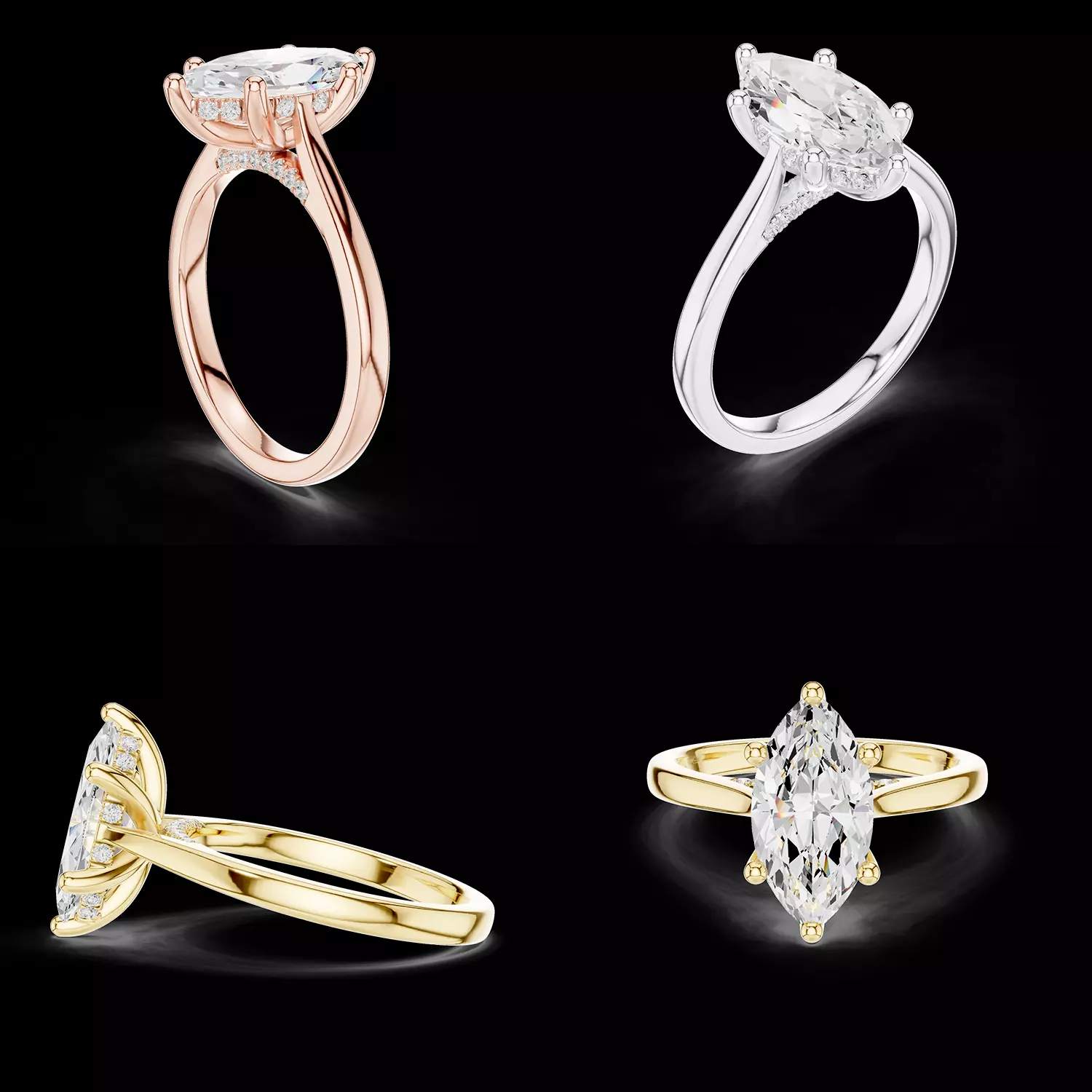 The smooth, polished shank maintains a minimalist and timeless aesthetic, allowing the dramatic marquise cut to remain the focal point. The gallery structure is engineered for durability and proper light exposure, ensuring optimal brilliance from the center diamond. Prongs are proportioned for secure stone setting while preserving a sleek and balanced look.