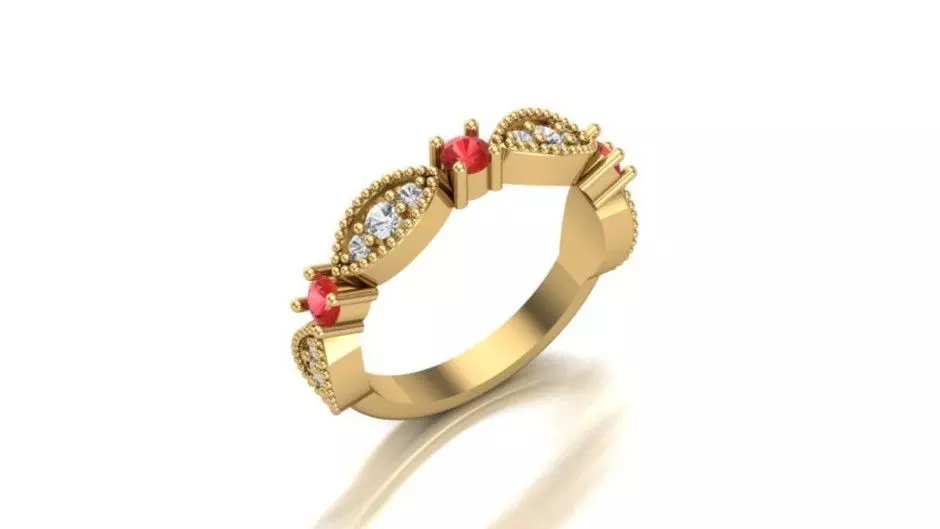 The defining feature of this ring is its series of marquise-shaped segments, each meticulously crafted and adorned with round beads and stones. The marquise shape, with its elongated and pointed ends, adds a touch of vintage elegance and sophistication to the ring. The segments are evenly spaced around the band, creating a continuous and harmonious design.