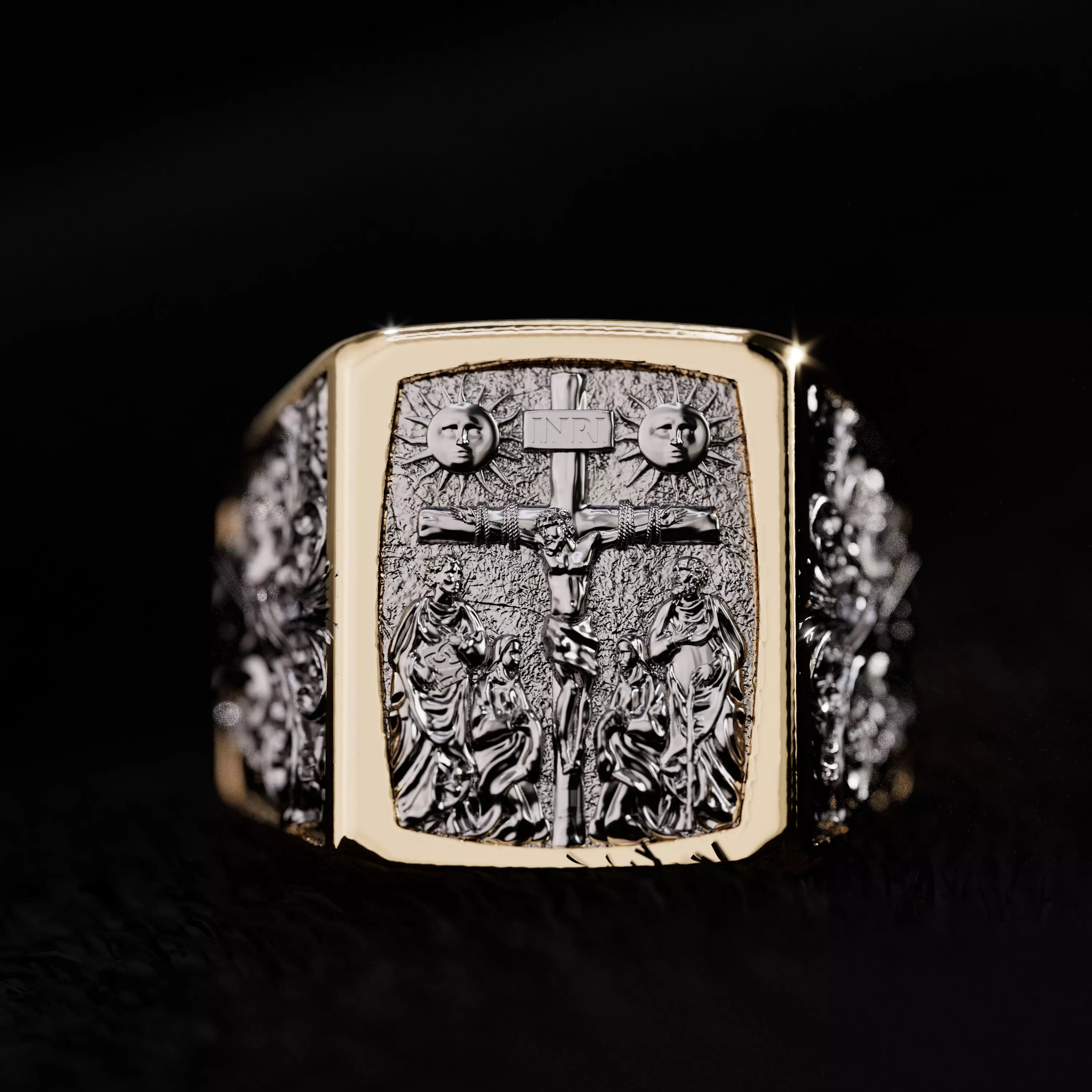 Anel Religioso Luxo – Crucificação de Cristo em Alto Relevo