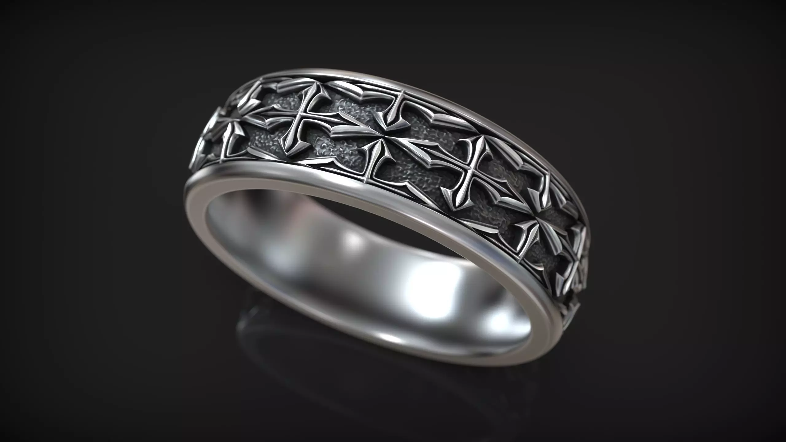 This band ring features a continuous repeating cross pattern carved in high-relief, creating a strong and timeless Christian design. The crosses are evenly spaced around the circumference, set against a textured recessed background that enhances depth and visual contrast. Smooth polished edges frame the ornamental band, giving the ring a balanced combination of refinement and strength.