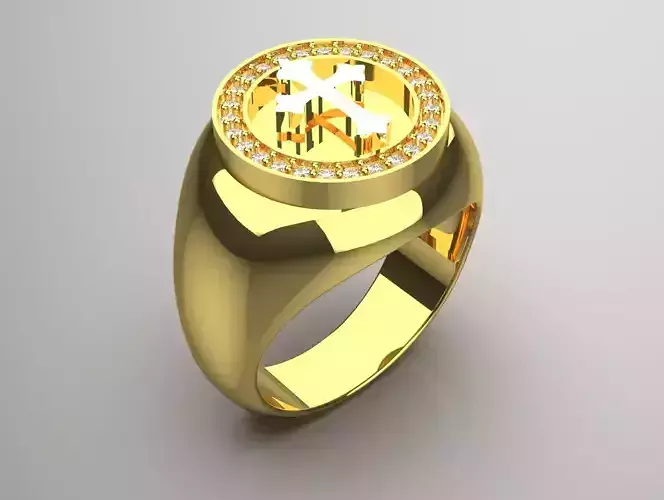 The image features a gold ring with a bold, modern design. The ring has a prominent, round top surface decorated with a ring of small diamonds around its perimeter, adding a sparkling touch. Centered within this diamond-encrusted circle is a large, stylized Chinese character made of white material, likely enamel or inlay, contrasting sharply with the gold background. The band of the ring is thick and shiny, with a sleek, polished finish that complements the ornate top. The overall design exudes a luxurious and contemporary aesthetic, with a cultural or symbolic touch provided by the character.