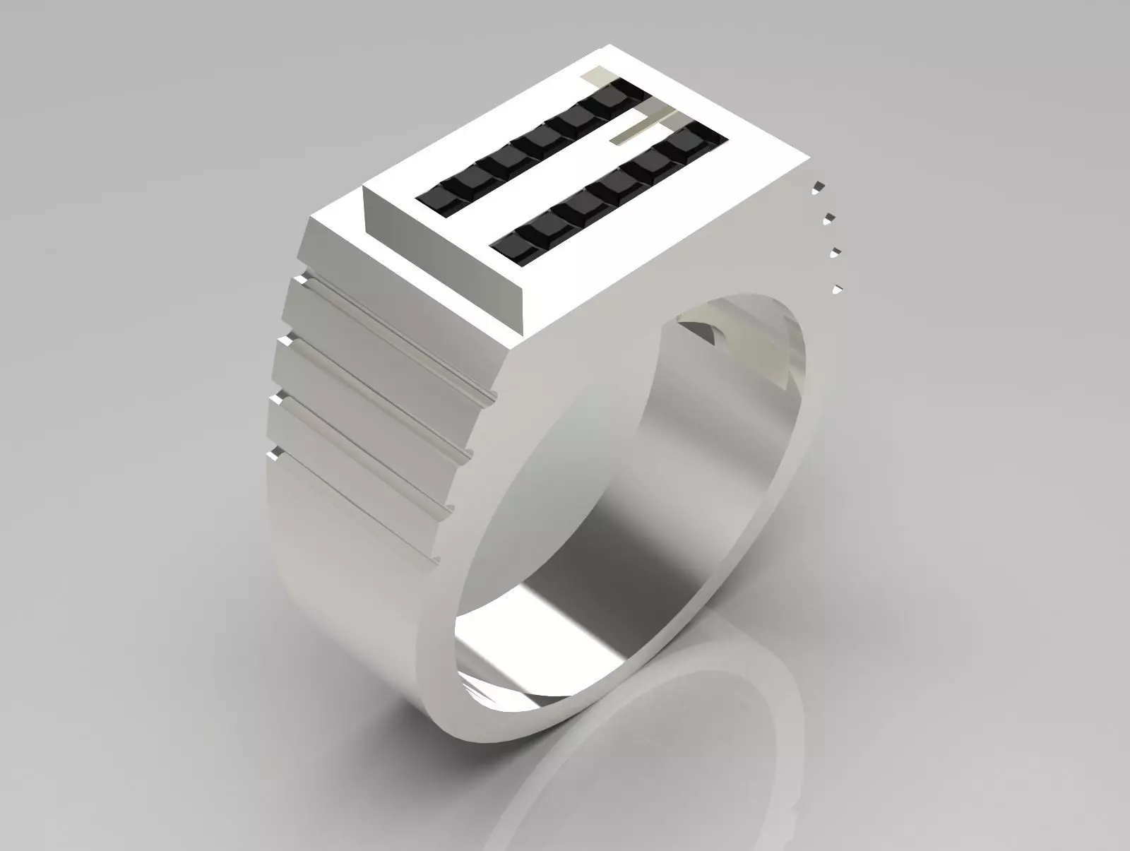 The image shows a modern, minimalist ring made of a shiny metallic material, likely silver or white gold. The ring has a broad band with a geometric design, featuring ribbed or stepped accents on one side, giving it a bold, structured appearance. On the top of the ring, there is a rectangular, raised section with black rectangular elements arranged in two parallel rows, separated by a slim gap, adding a contemporary and stylish touch. The overall design is sleek, clean, and industrial-inspired, emphasizing geometric simplicity and contrast.
