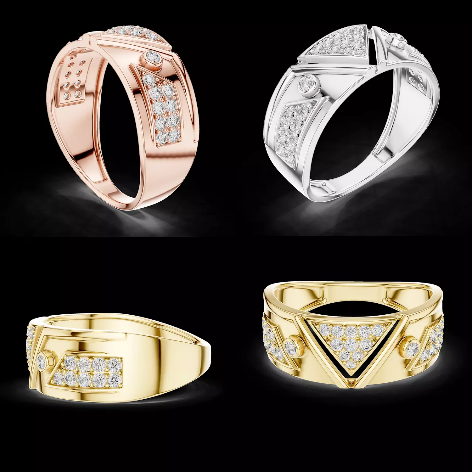 This bold men's diamond ring features a striking triangular cluster centerpiece, designed with a modern geometric aesthetic. The center is crafted with a triangle-shaped setting filled with multiple round diamonds, creating a sharp and eye-catching brilliance.