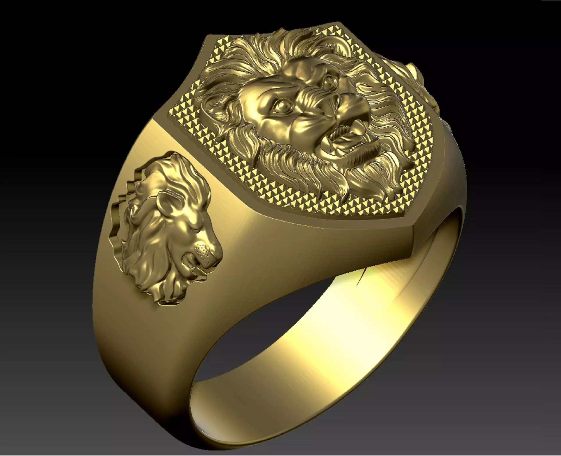 mens signet ring with lions two options. american size 11.5 (diameter 21 mm) 14k gold weigth 15 and 17 gr. silver weigth 13 and 14 gr.Two different options.You can see the dimensions of the model on one of the photos presented here.There 3dm file for editing and stl for printing.90% of my 3d models have been checked: made wax and finished product in gold or silver . High polygonal model.Made in program Matrix+Rhinoceros+Zbrush . Model was checked and healed in program Magics .Ready for the print. Mesh: vertex count = 269899 facet count = 427460Cumulative Volume = 1329.9 (+/- 1e-06) cubic millimeters for 2 solids