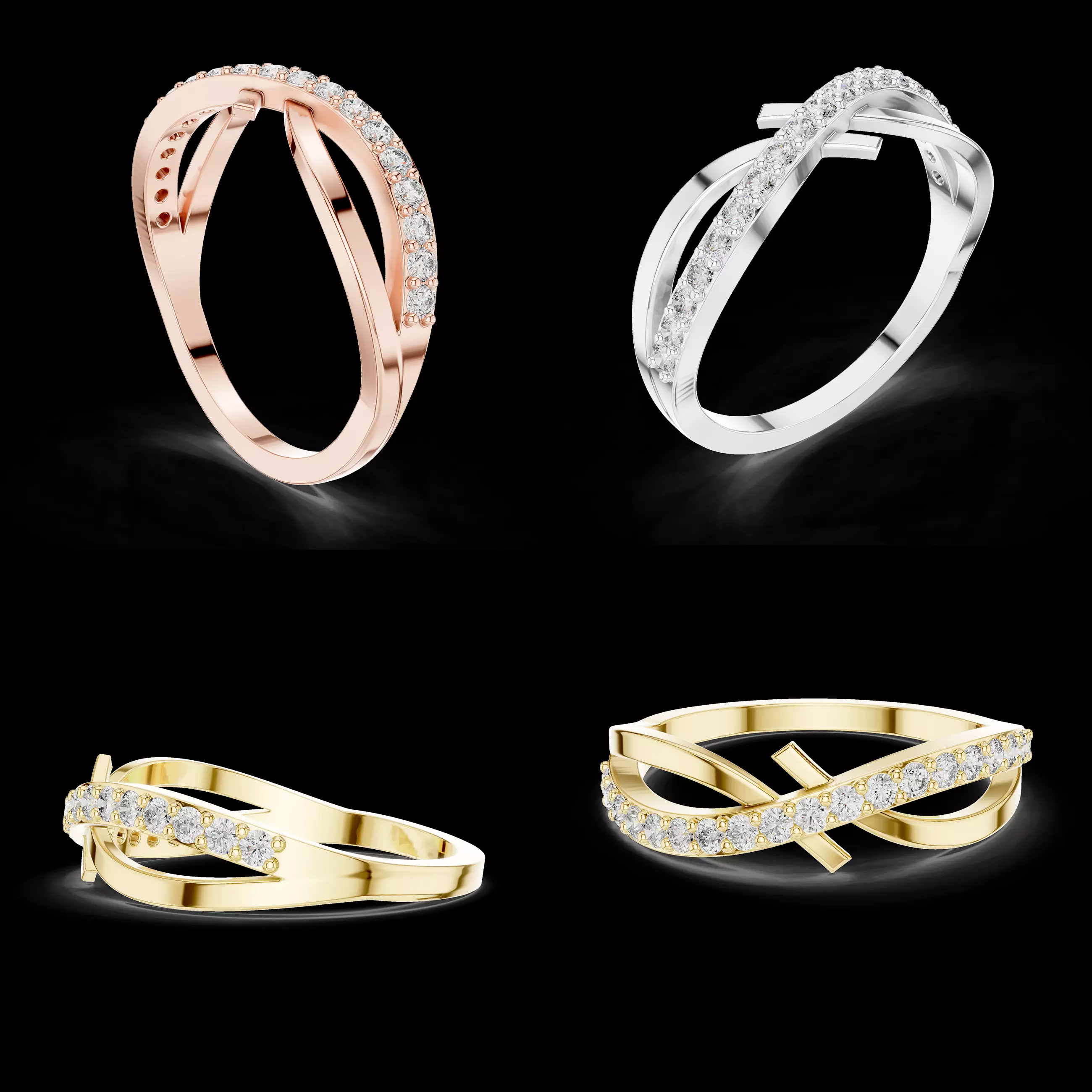 This modern crossover diamond ring features a clean, flowing structure where two smooth bands intersect gracefully, enhanced by a refined pavé-set row of diamonds. The design offers a perfect balance between minimal elegance and contemporary luxury, making it highly suitable for daily wear collections and premium fashion jewellery.