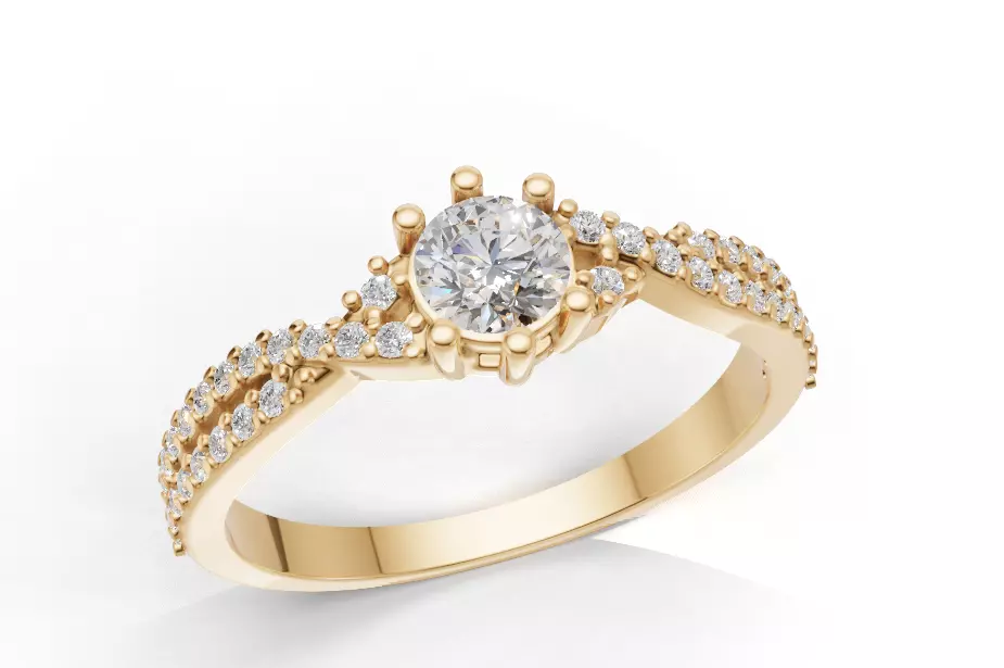 Modelo 3D de anel solitário clássico, com aro duplo cravejado e pedra central. A peça conta com 1 pedra central de 4mm e 44 pedras laterais de 1mm, proporcionando um visual sofisticado, moderno e atemporal. Ideal para uso como anel de noivado, compromisso ou presente especial.