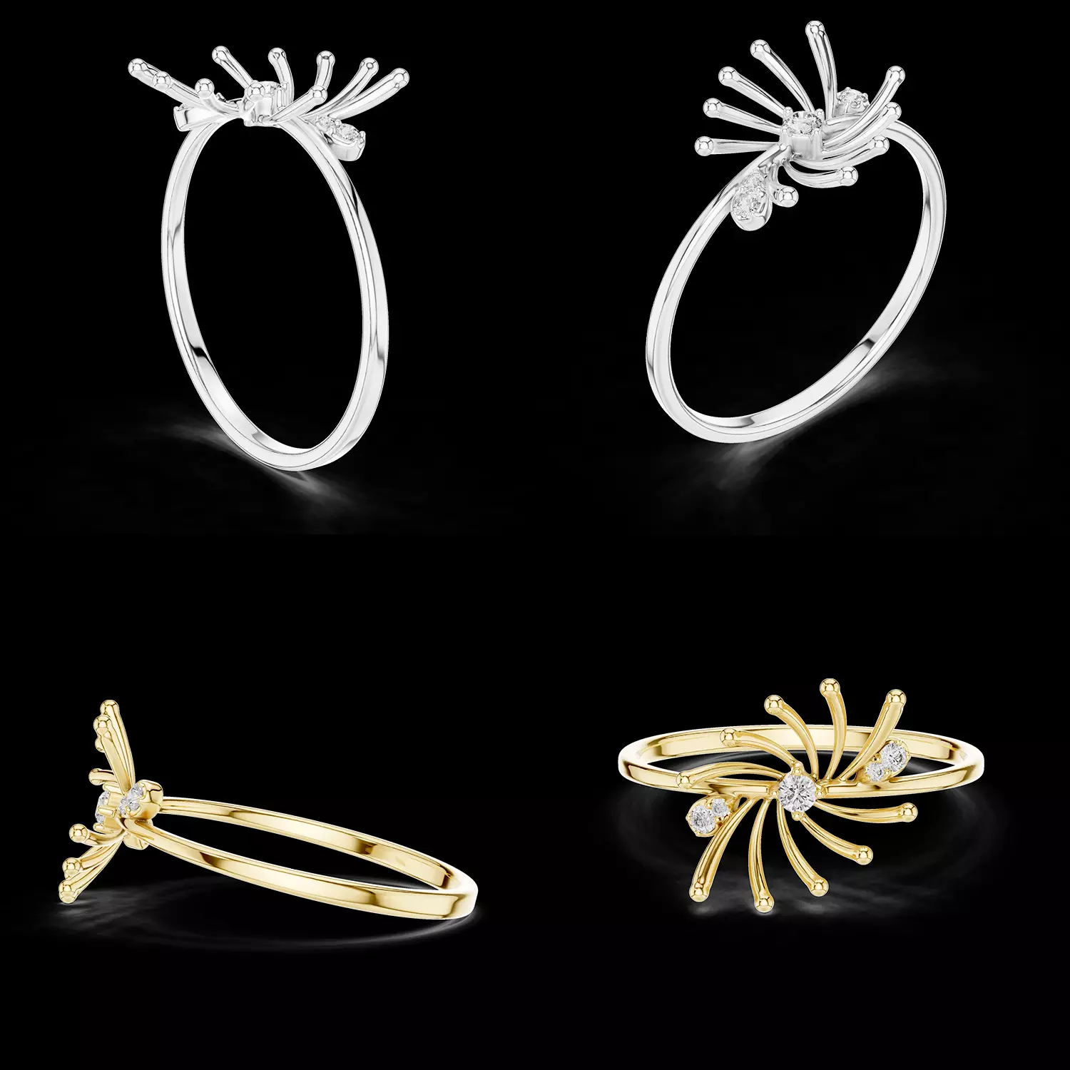 This modern abstract diamond ring CAD model features a bold and artistic design inspired by organic shapes and dynamic movement. The ring showcases a striking centerpiece composed of multiple slender curved elements that radiate outward like delicate rays, creating a sculptural and contemporary appearance.
