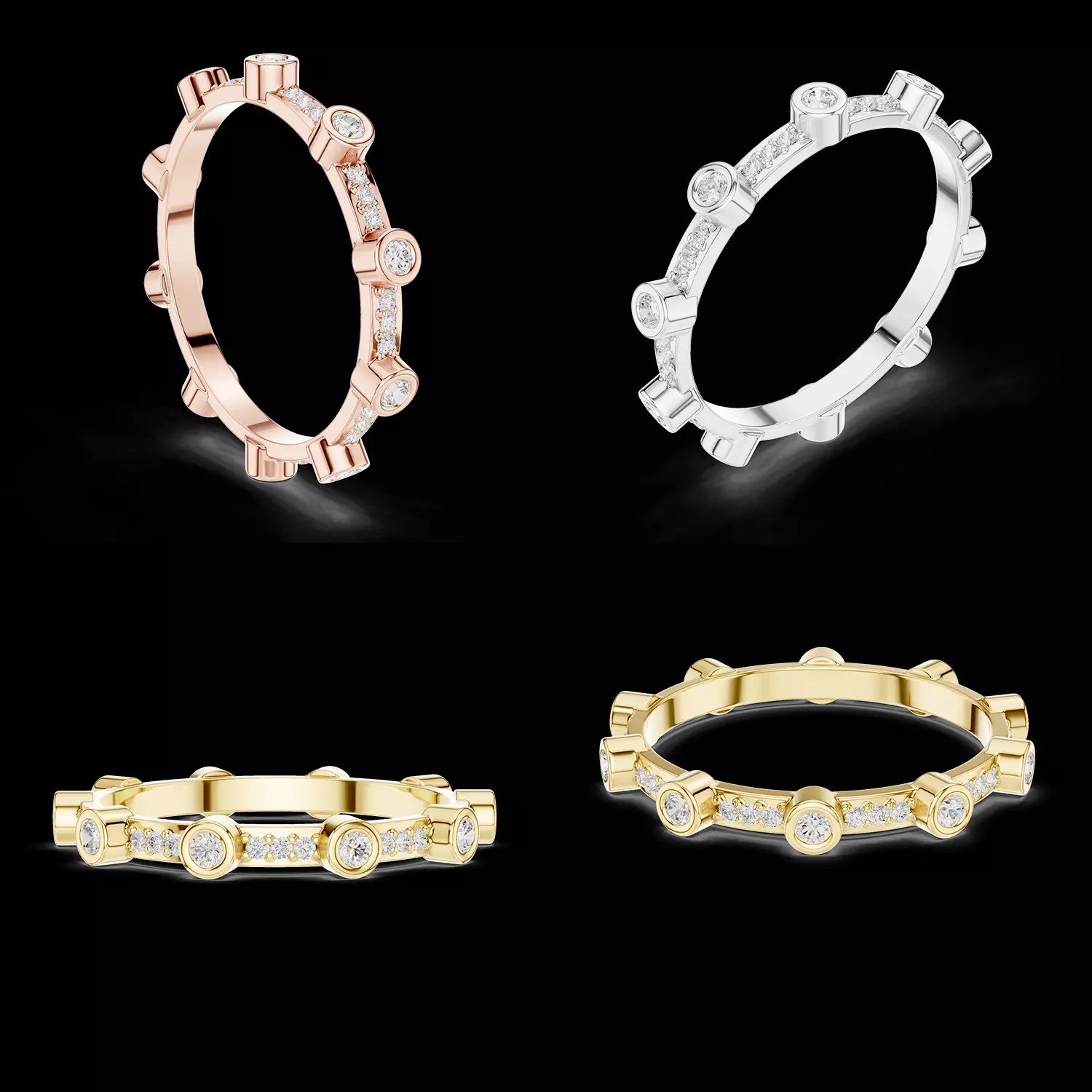 Each round diamond is securely enclosed within a smooth bezel frame, enhancing durability while maintaining clean geometric lines. Between the bezel stations, smaller diamonds are precisely set in a refined channel or pavé layout, adding subtle brilliance and visual rhythm around the ring.