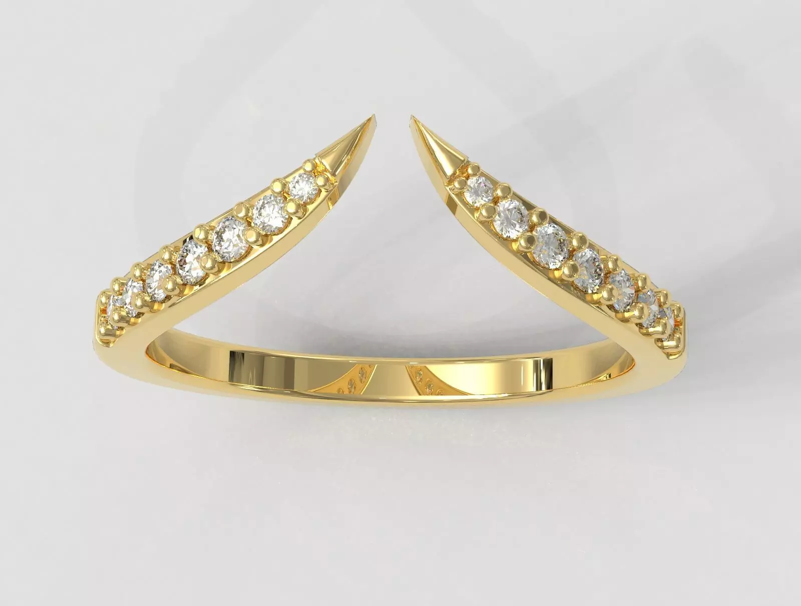 This elegant and contemporary ring features a bold V-shaped open design, highlighted by a row of round diamonds set along both tips. The sharp geometry combined with smooth curves creates a perfect balance between minimalism and luxury.