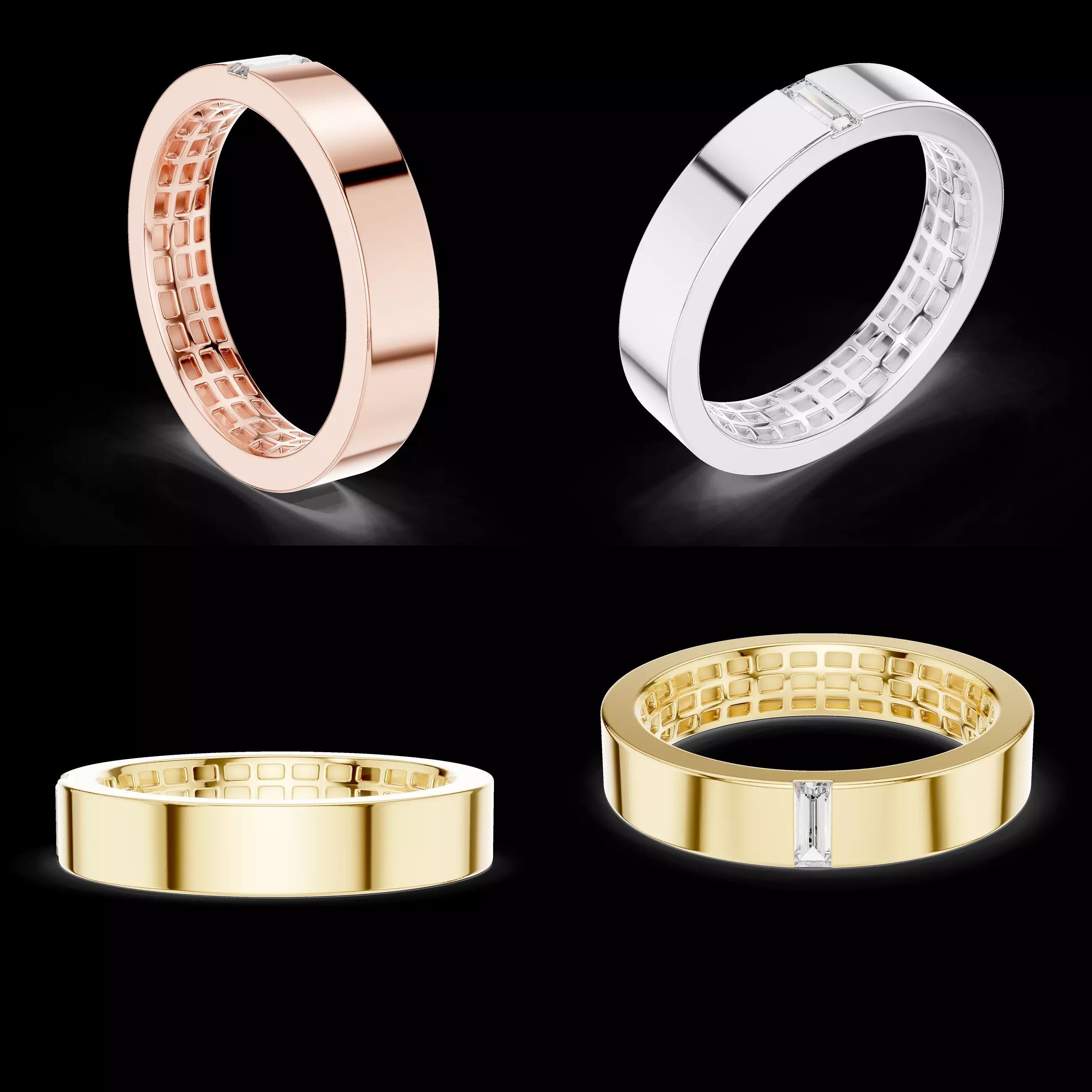 This modern diamond band ring CAD design features a bold flat-profile structure with a sleek baguette-cut diamond setting, delivering a clean and contemporary luxury look. The sharp geometry and smooth exterior surfaces give the ring a strong, premium presence while maintaining timeless elegance.