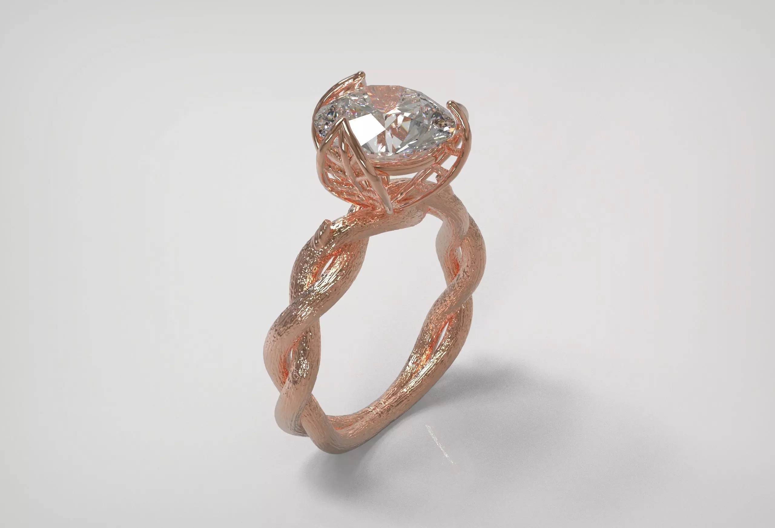 This design centers around a beautiful oval-cut solitaire setting, securely held by elegant prongs that seamlessly emerge from the intertwining band. Perfect for jewelers, 3D printing enthusiasts, or custom design services looking for a distinctive, nature-inspired piece.