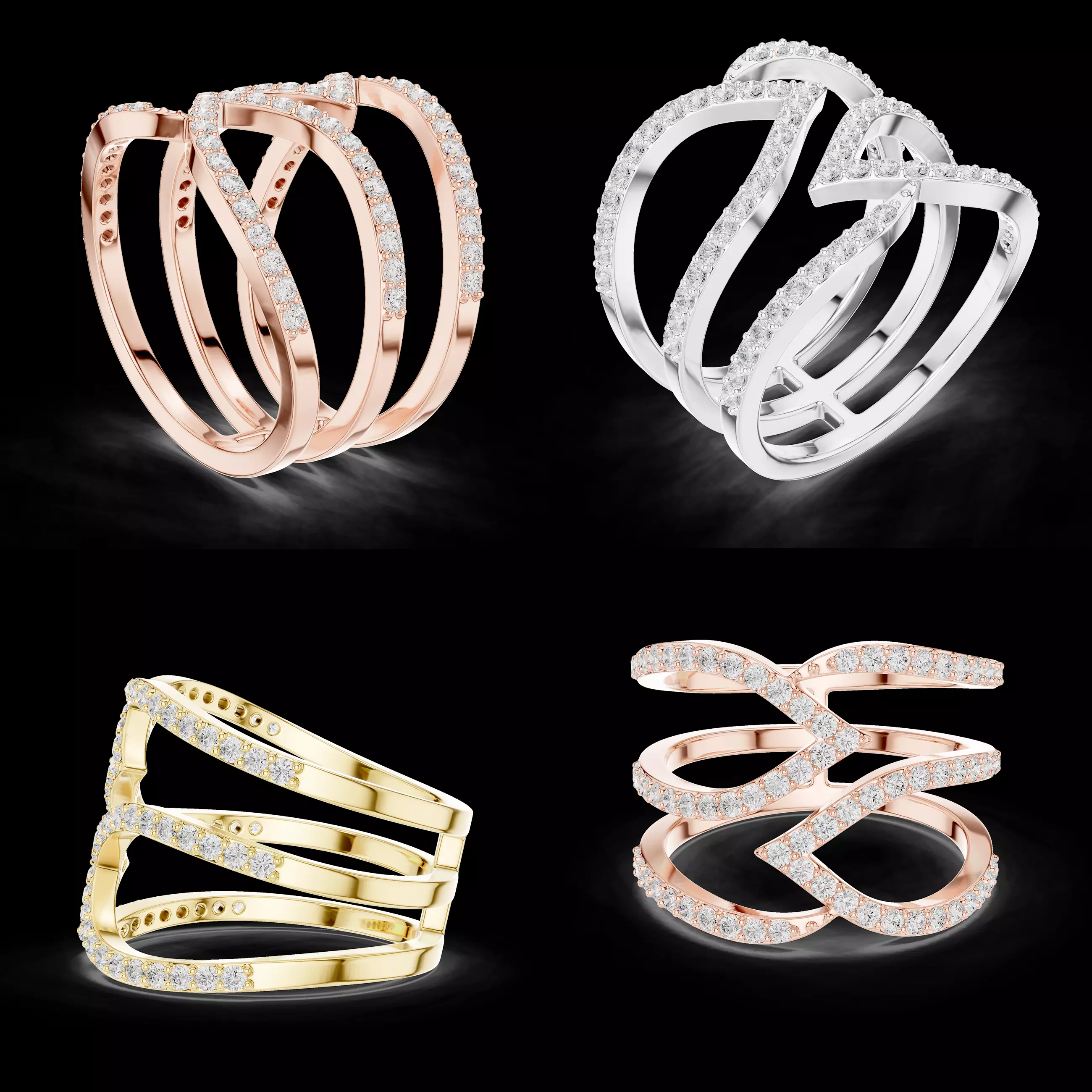 This modern multi-band crossover diamond ring CAD design features an elegant layered structure with interwoven bands highlighted by precisely set stones. The flowing crossover pattern creates depth and movement, giving the ring a bold yet sophisticated appearance suitable for high-end jewellery collections.